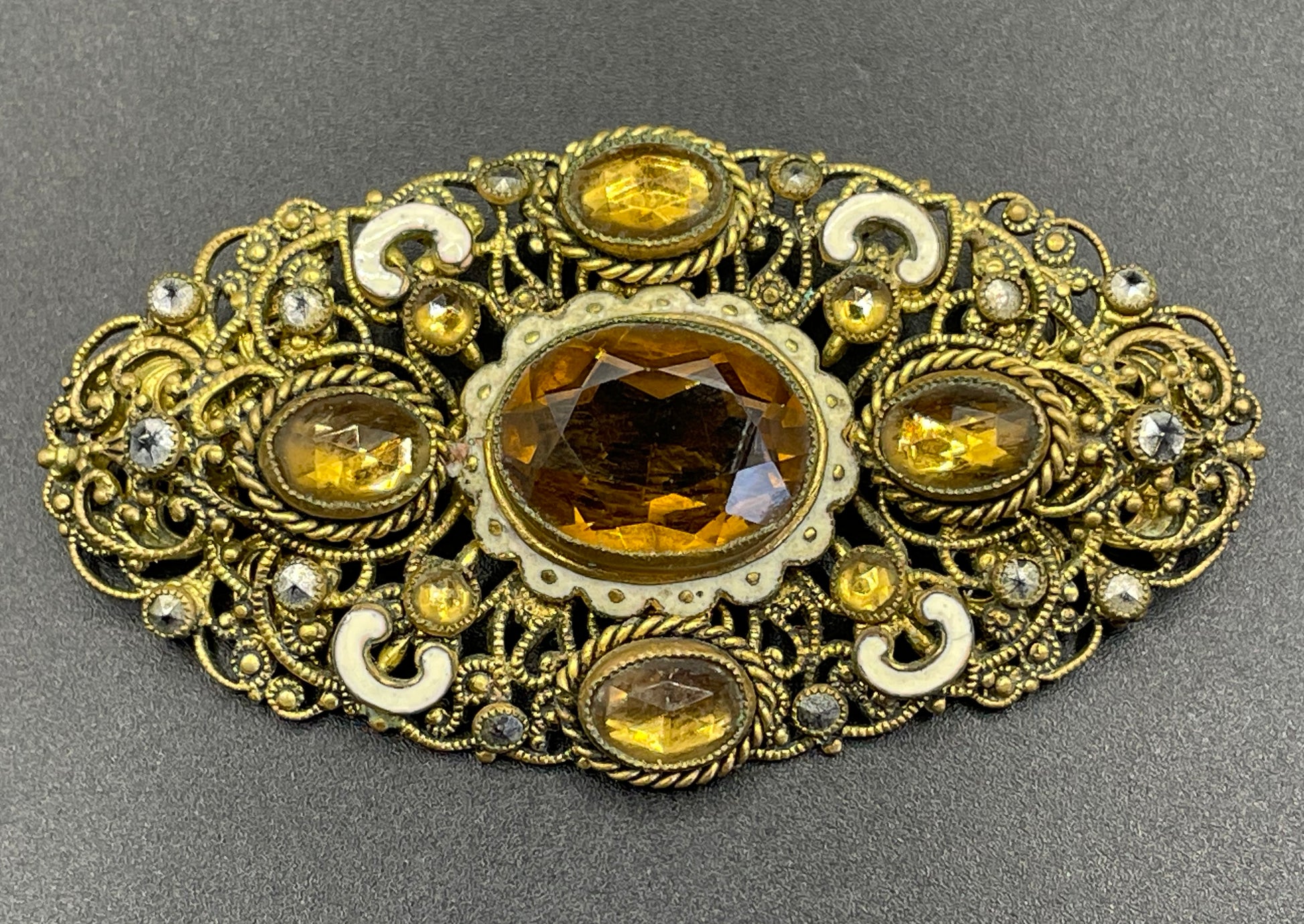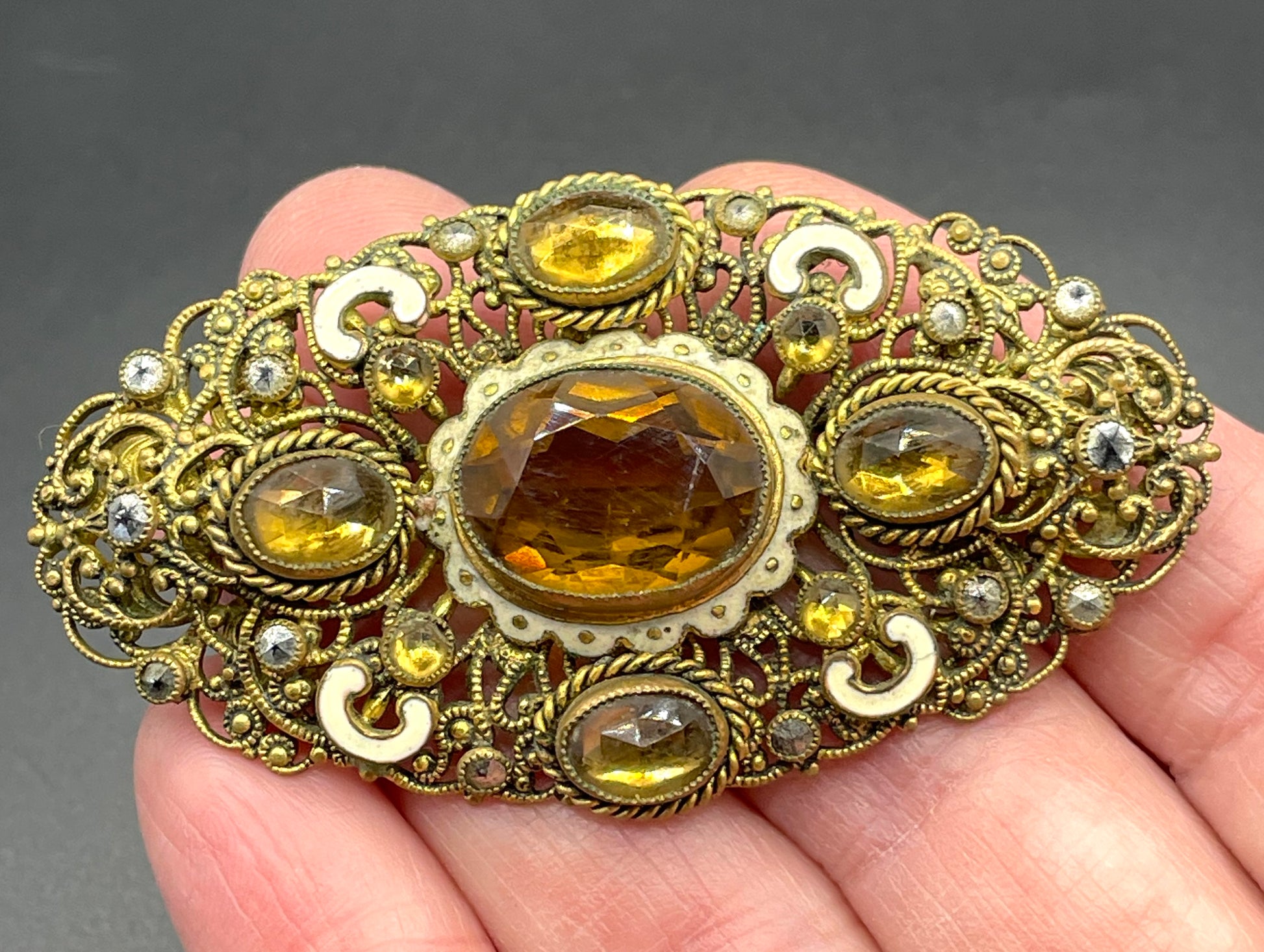 It is beautifully designed and produced. The oval filigree base is embellished with a large central faux citrine paste stone surrounded by smaller glass stones, marcasite stones (perhaps glass with a marcasite-like coating as there is a small amount of rubbing to this) with white enamel decoration for some of the floral filigree design around. It is about 2.5 inches long and 1 1/4 inches wide.
