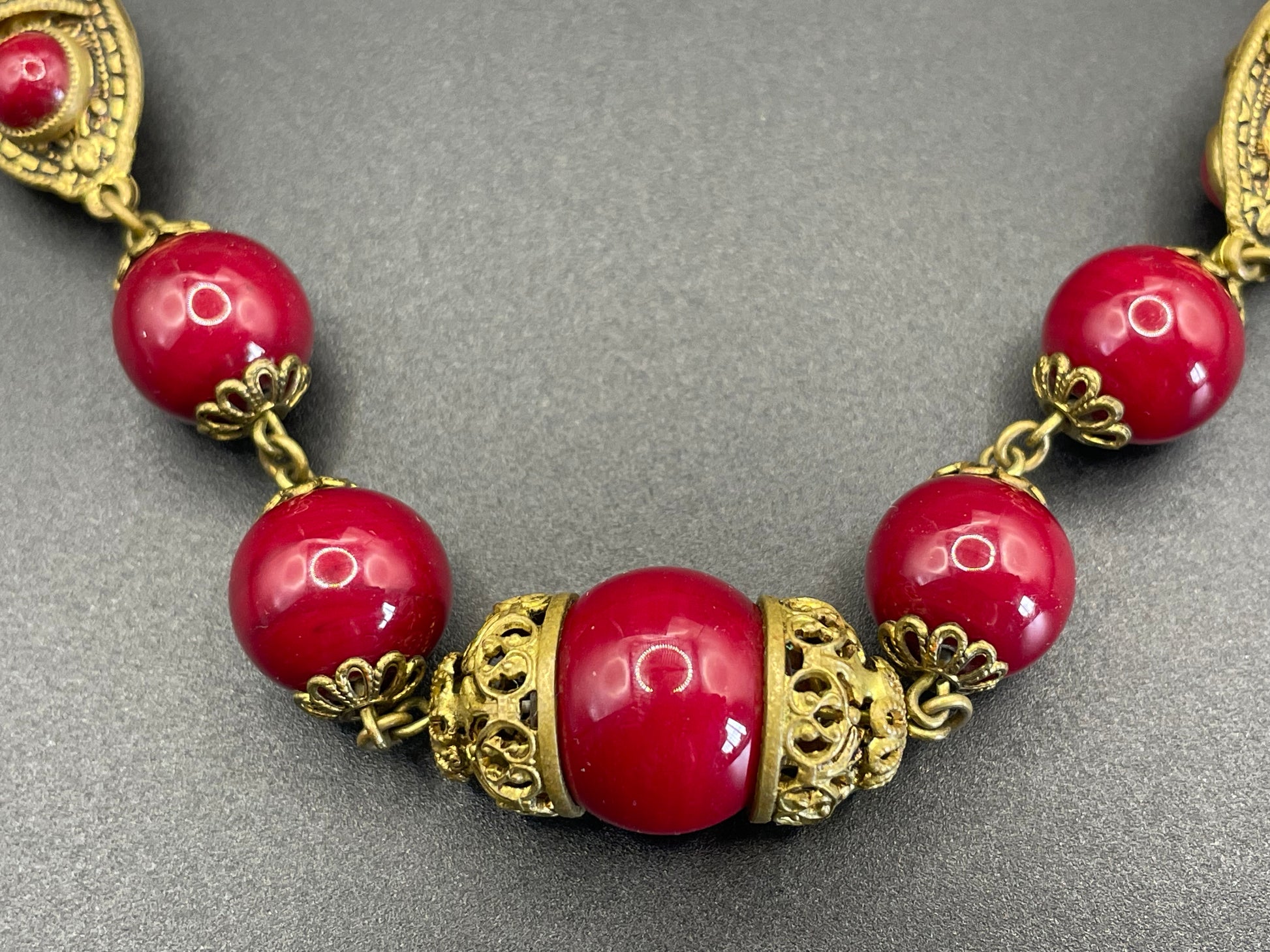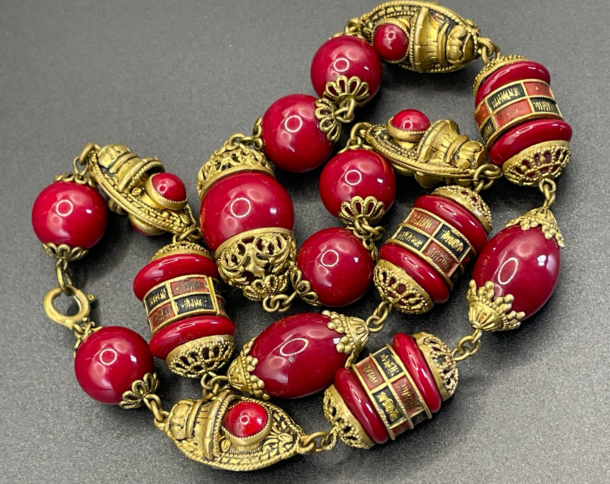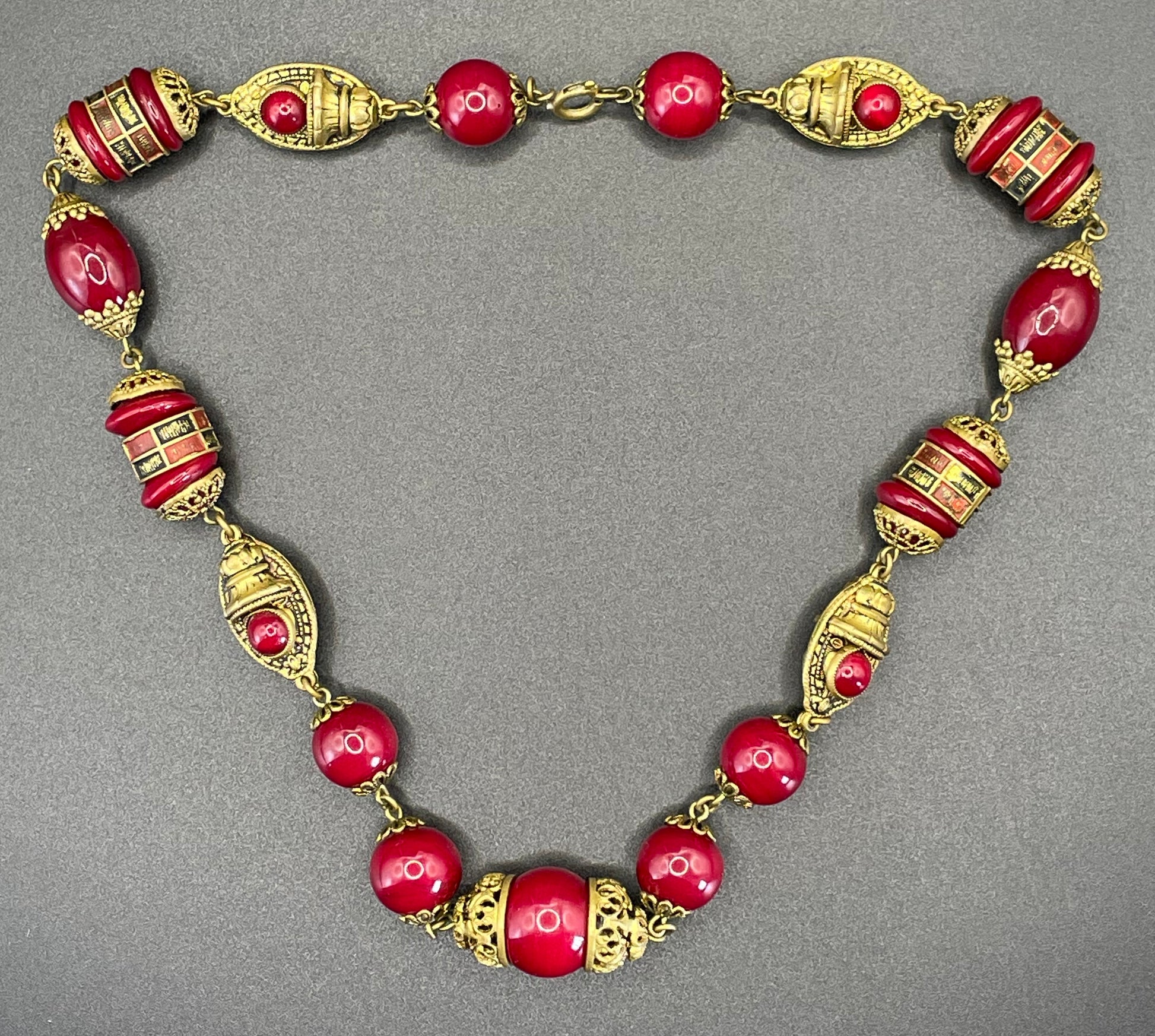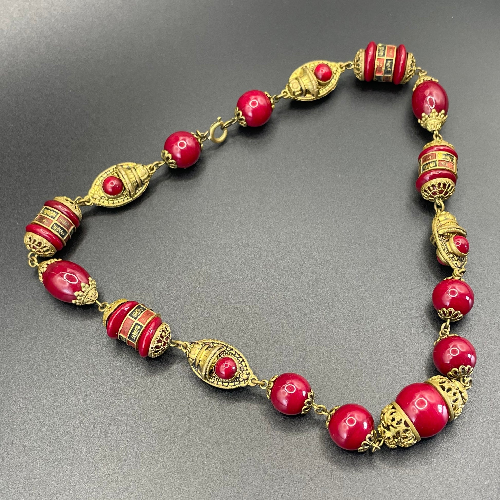 Vintage Neiger Brothers Art Deco heavy red glass bead necklace with beautiful gold tone features - by Max Neiger