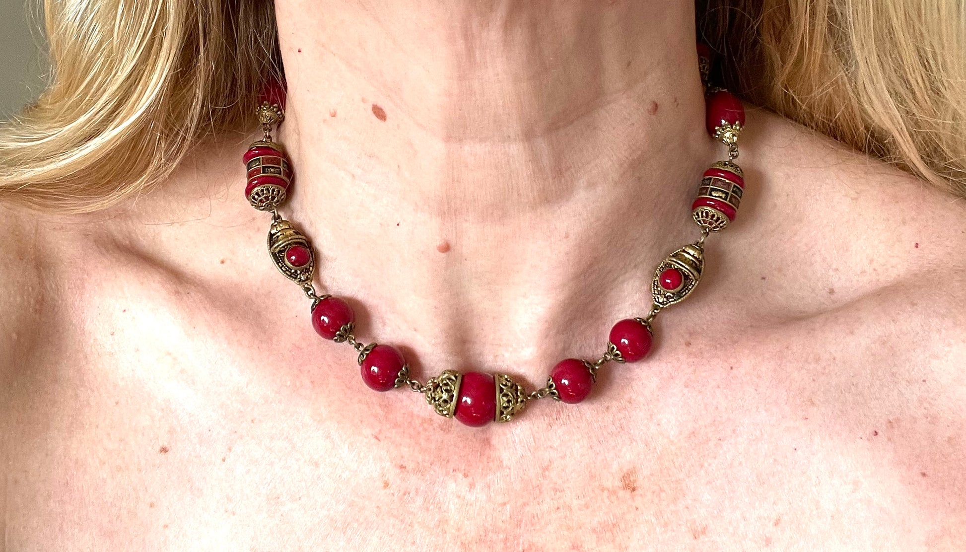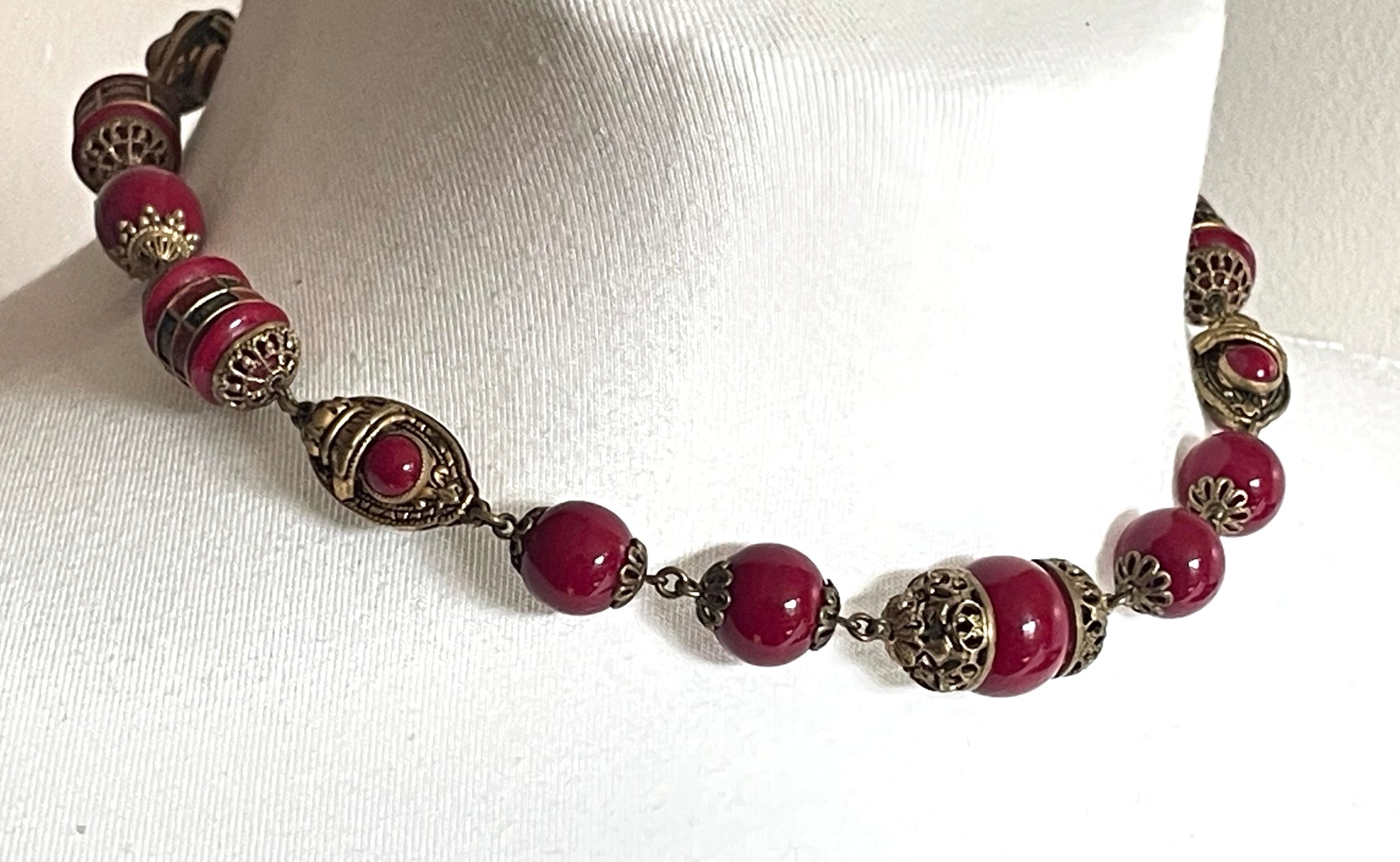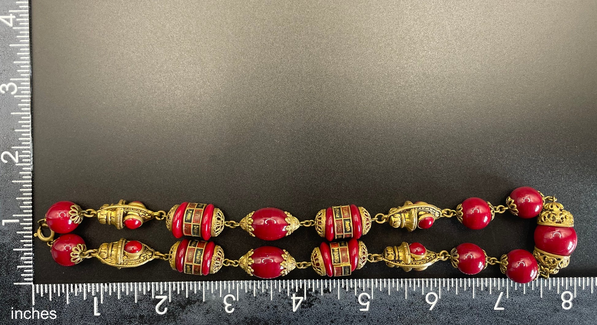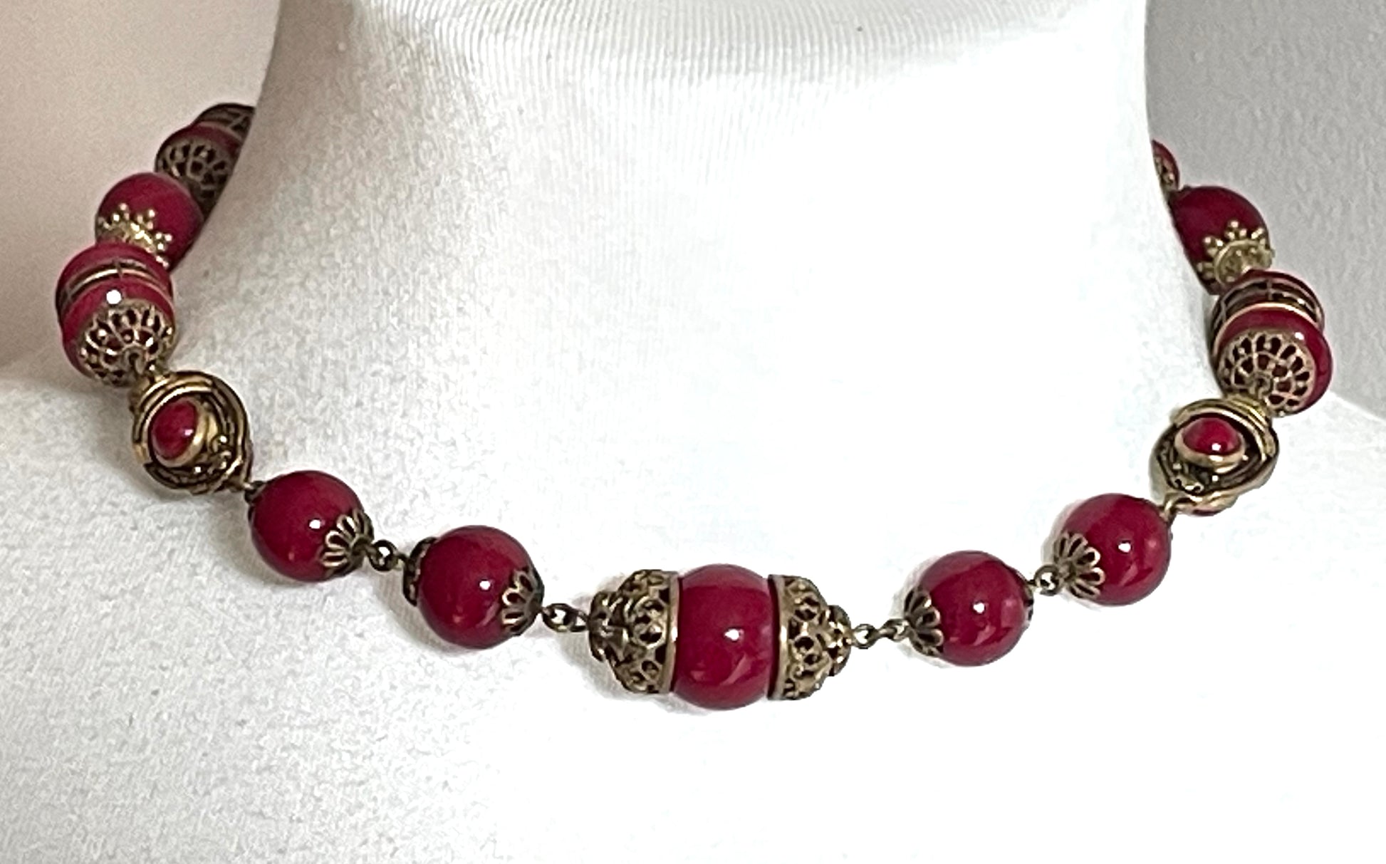 Vintage Neiger Brothers Art Deco heavy red glass bead necklace with beautiful gold tone features - by Max Neiger
