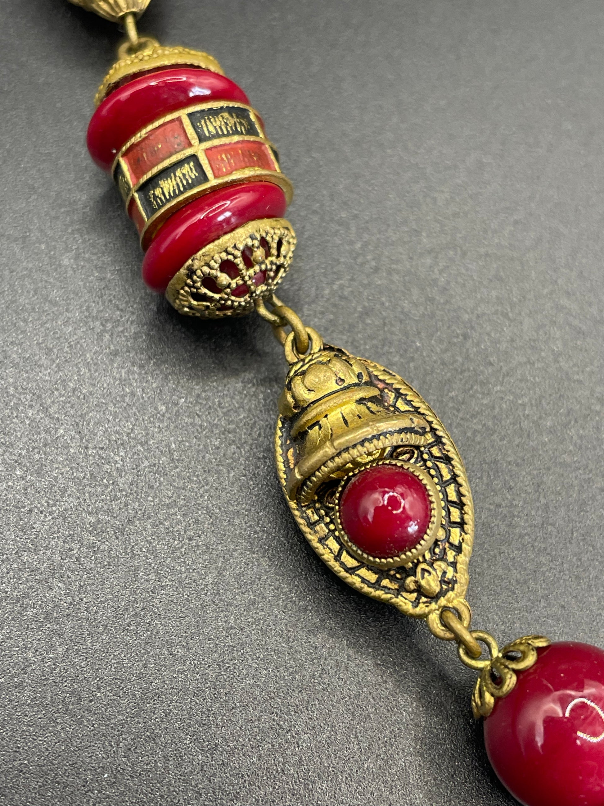 Vintage Art Deco Neiger brothers red glass bead and gold tone heavy necklace. Absolutely stunning piece with beautifully made gold tone repousse features and bead caps, interspersed with vibrant large red glass beads and cabochons. I can't do it justice in writing, please do look at the pictures carefully and message me if you require more.