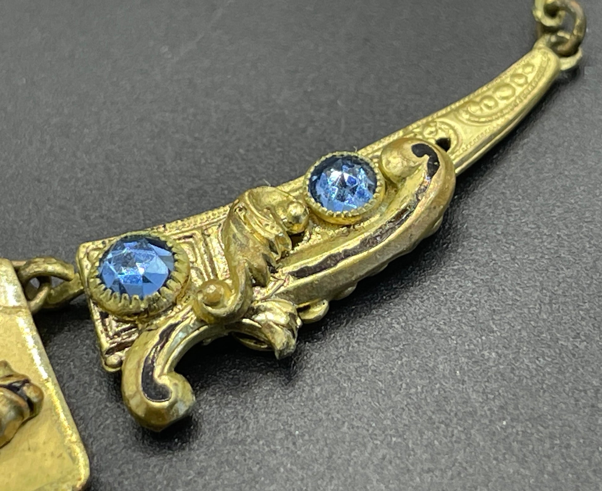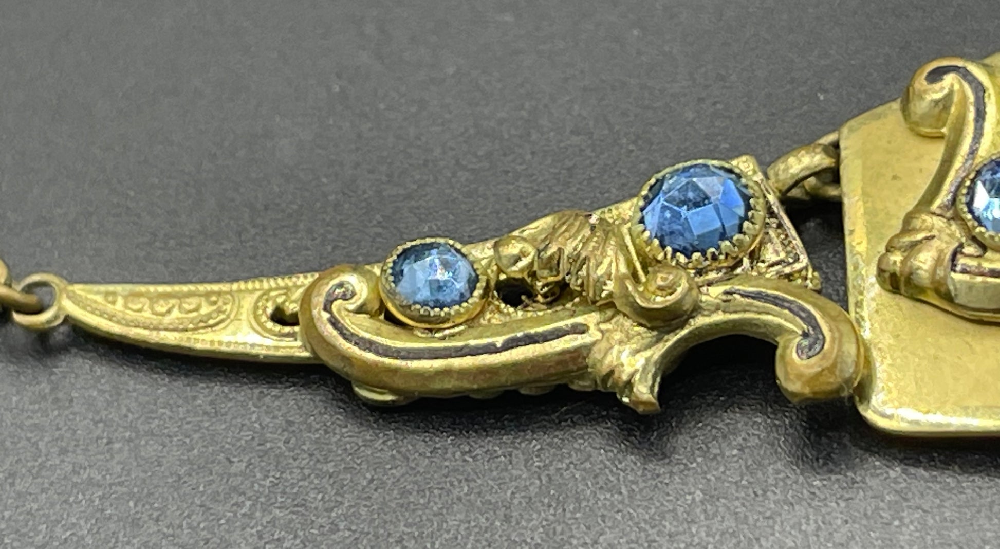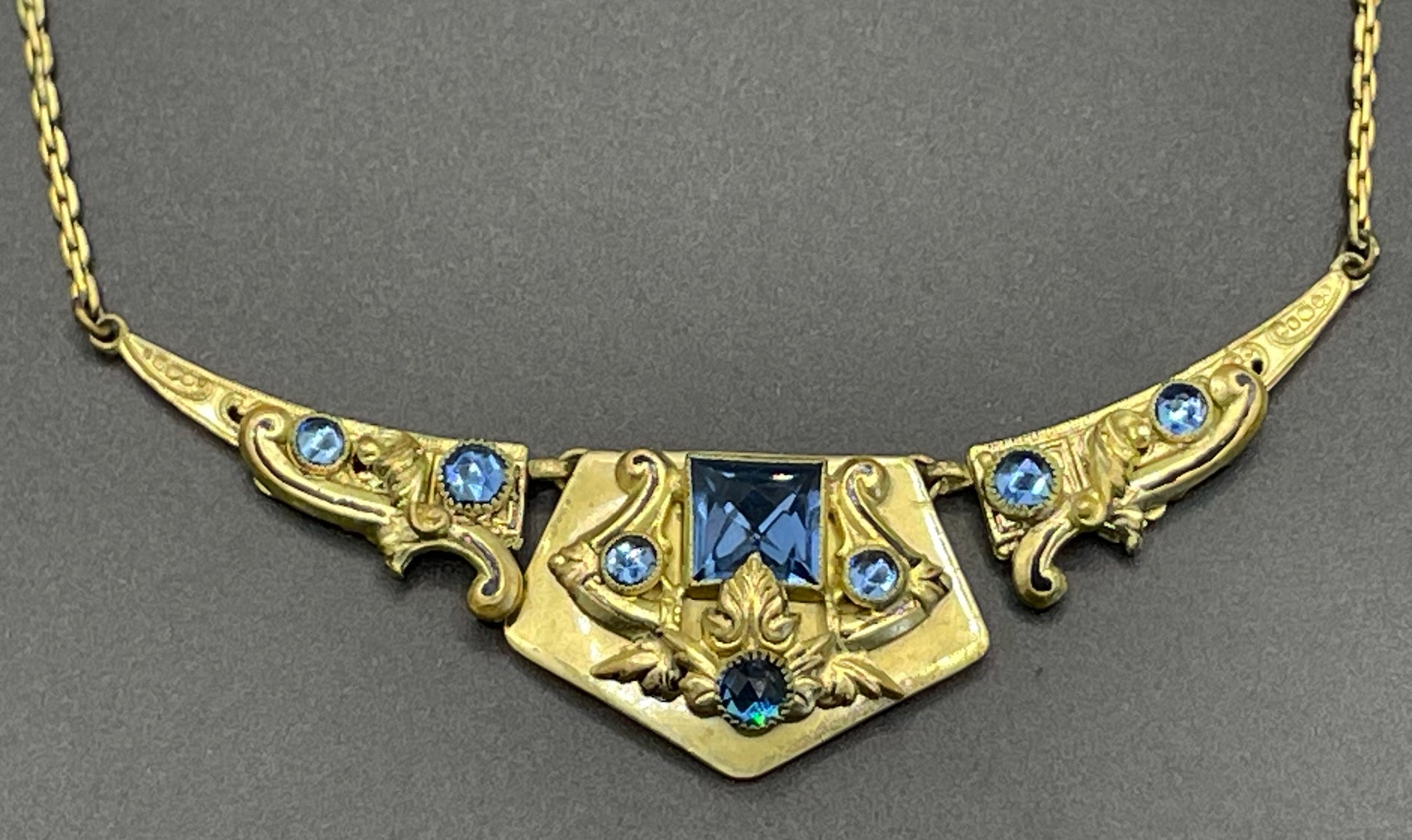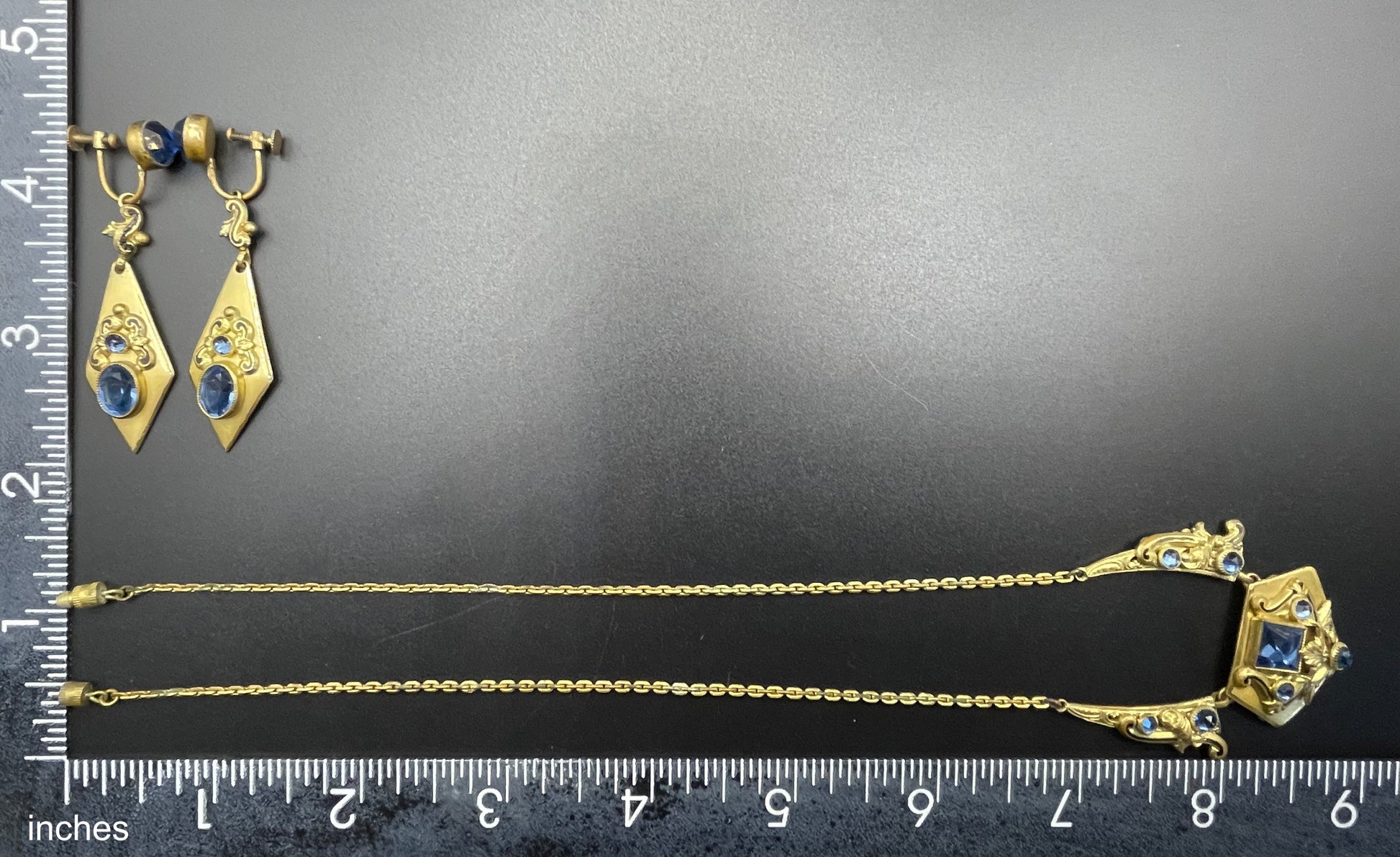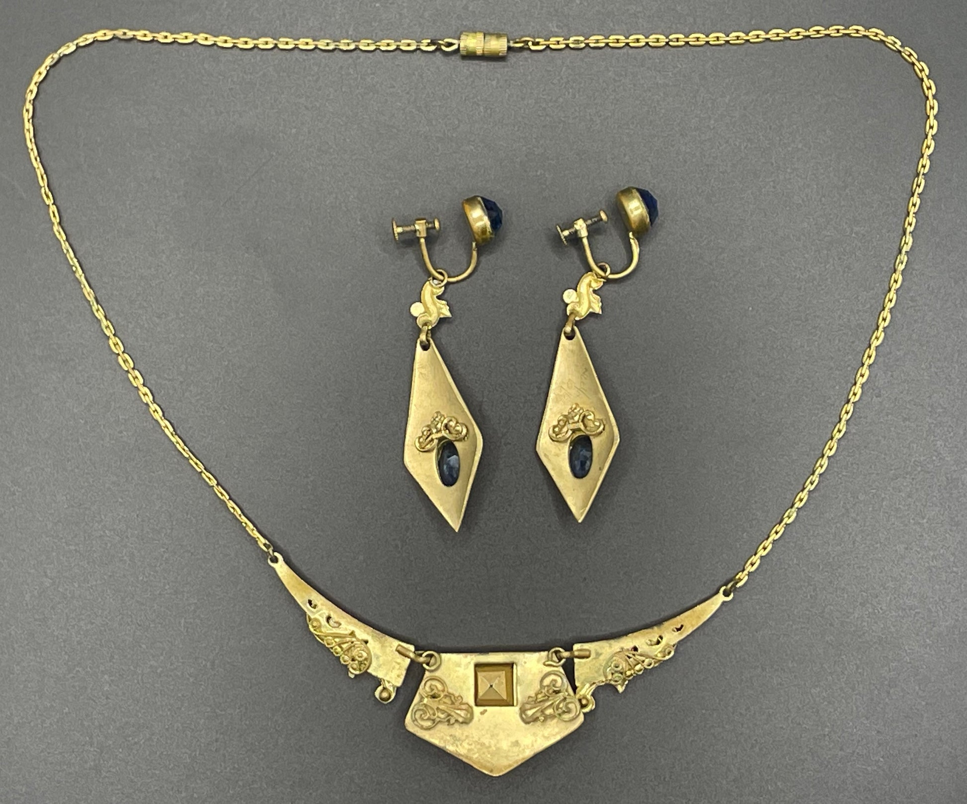 Vintage Neiger brothers sapphire blue rhinestone ornate Art Deco necklace and screw back earrings set in gold tone
