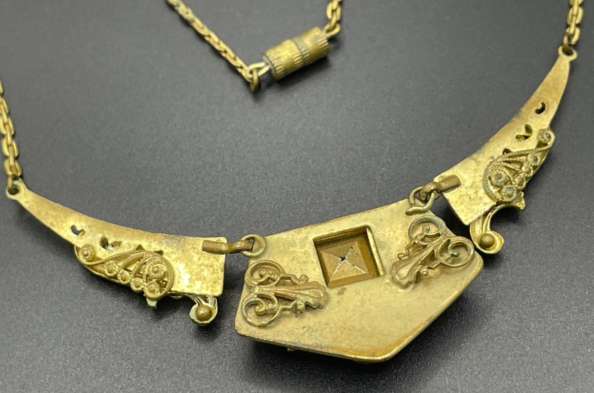 Vintage Art Deco blue glass rhinestone, black enamel and gold tone necklace and screw back earrings set by Max and Norbert Neiger. These are absolutely stunning pieces with beautifully made and ornate gold tone settings - a lovely example for any collector or wearer.
