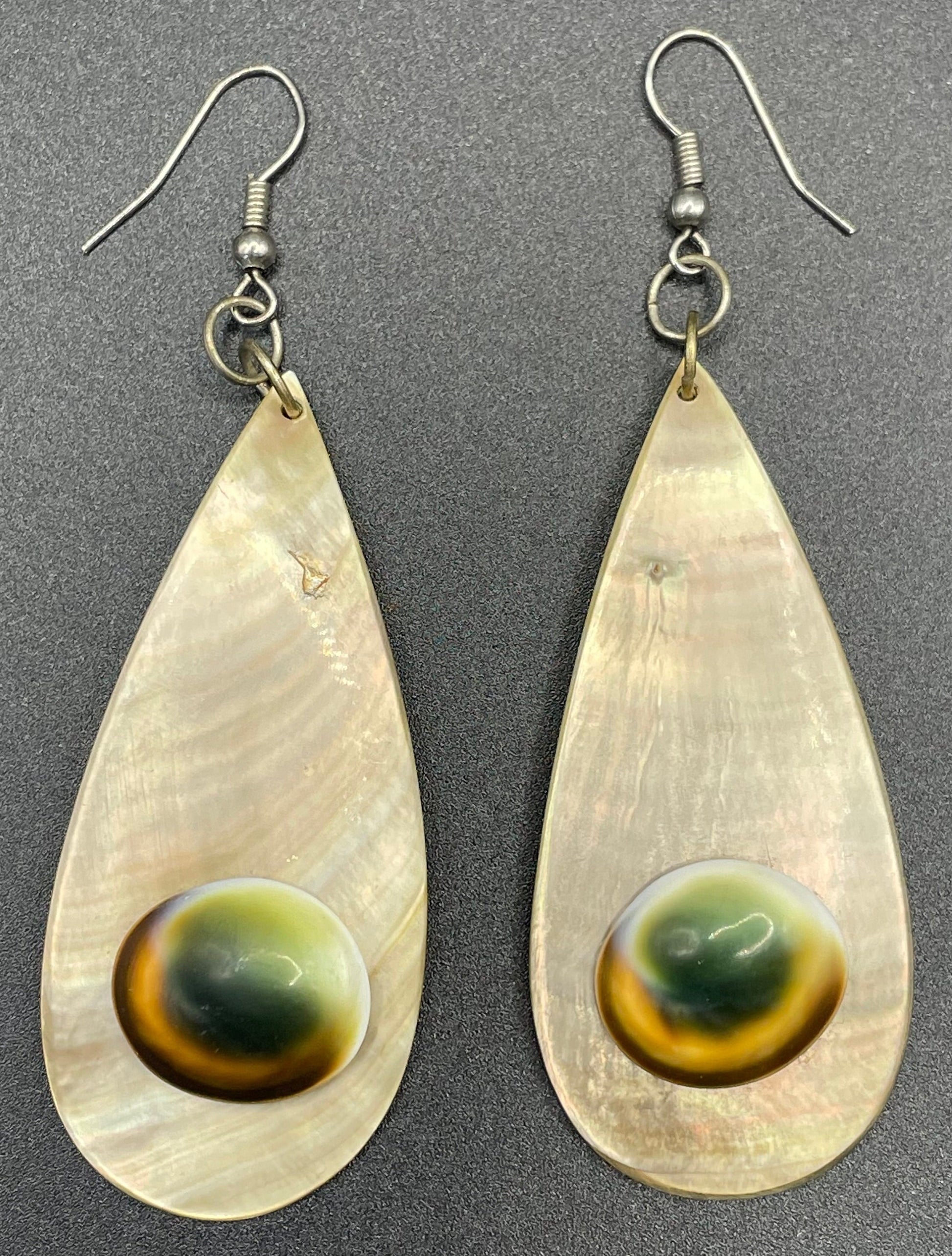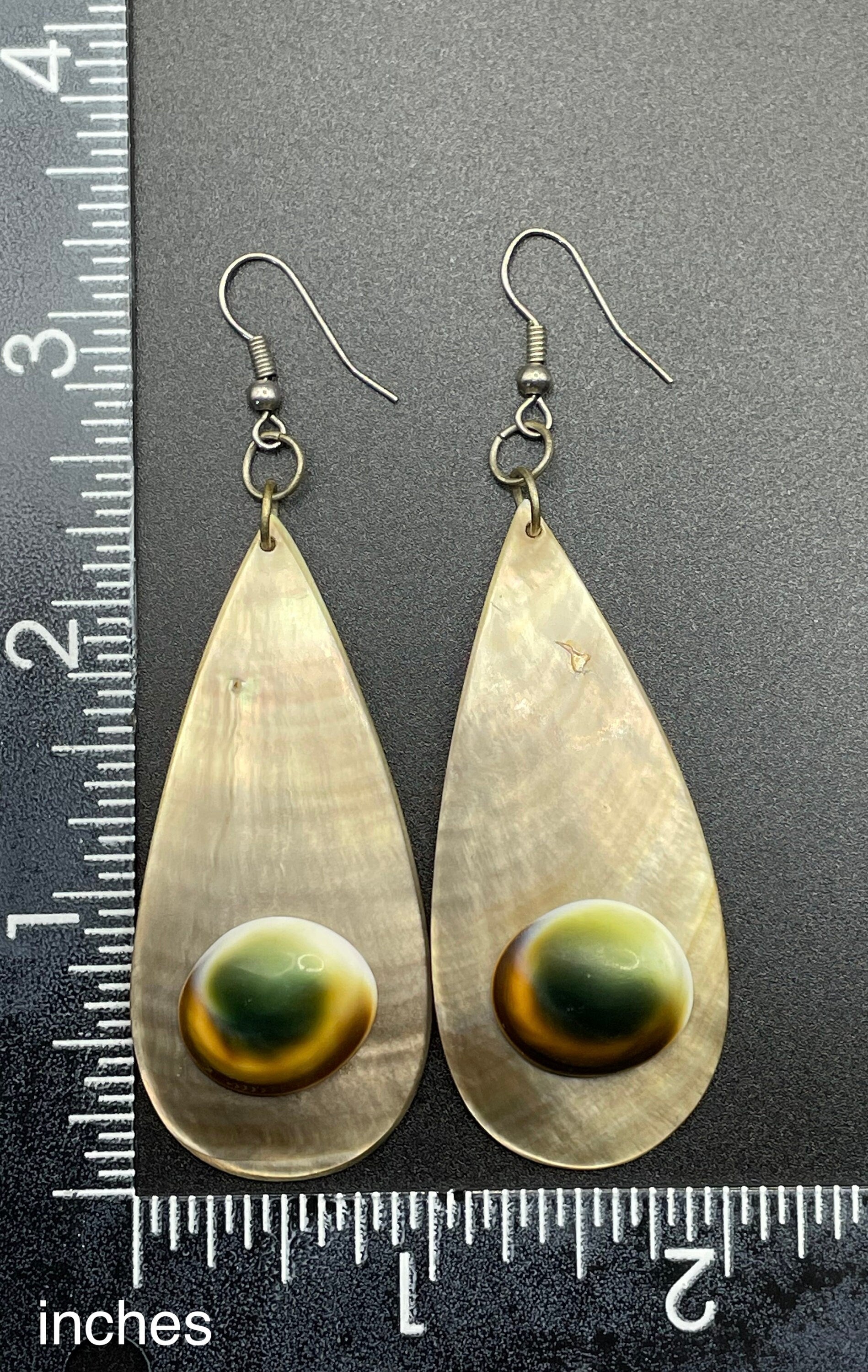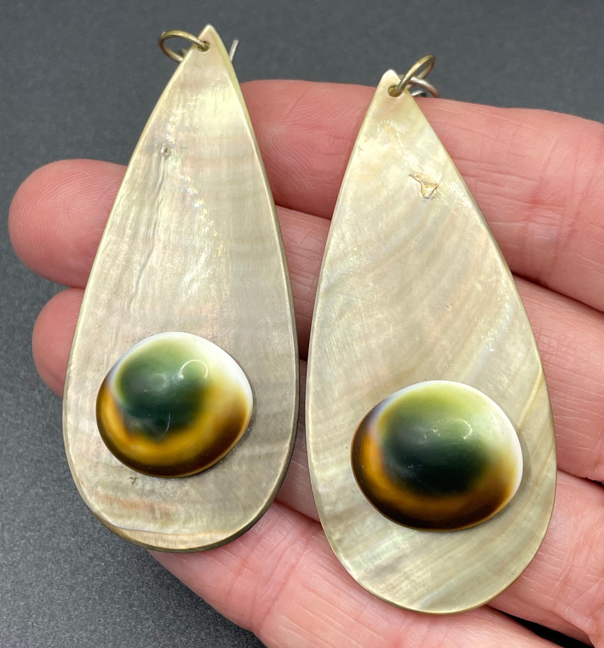 Vintage operculum cabochon and shell / abalone teardop long dangle earrings for pierced ears
