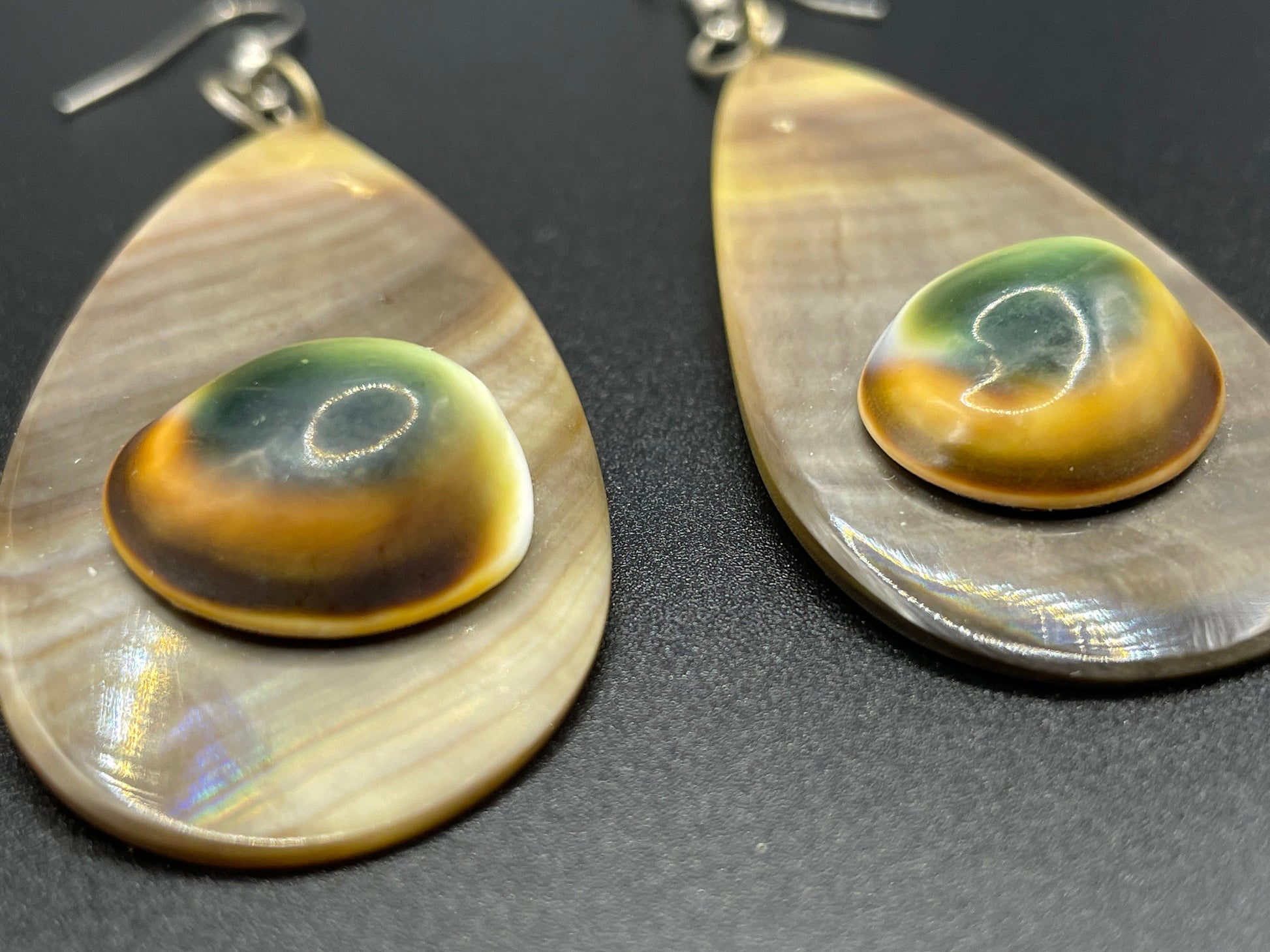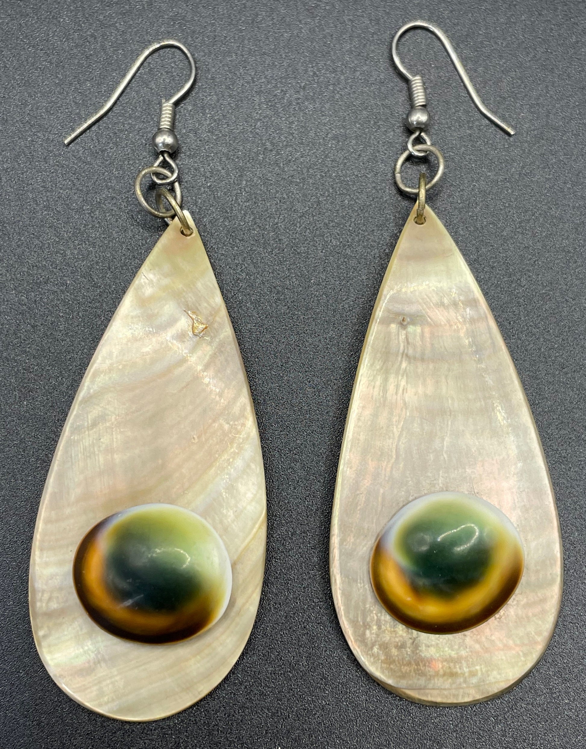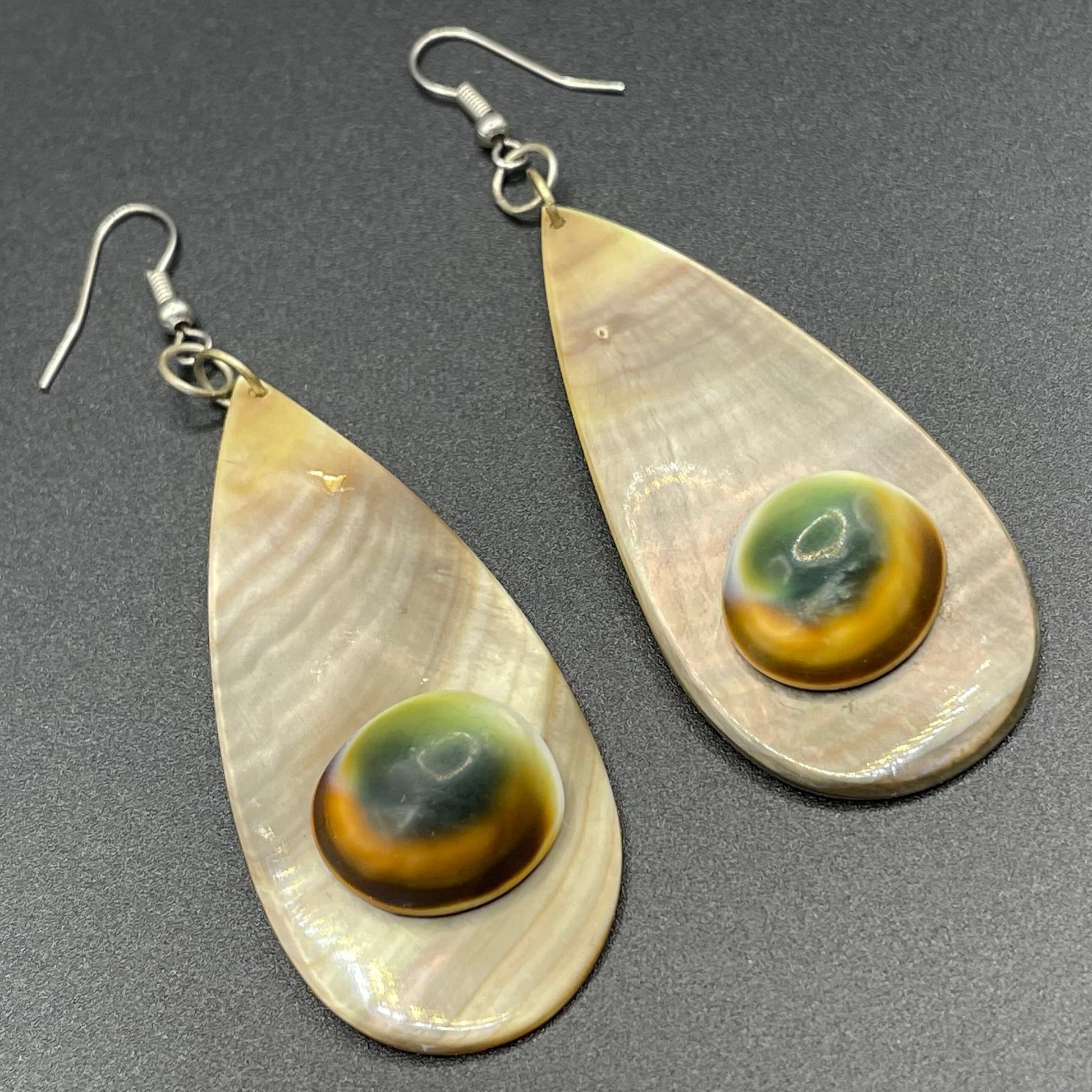 Vintage operculum cabochon and shell / abalone teardop long dangle earrings for pierced ears