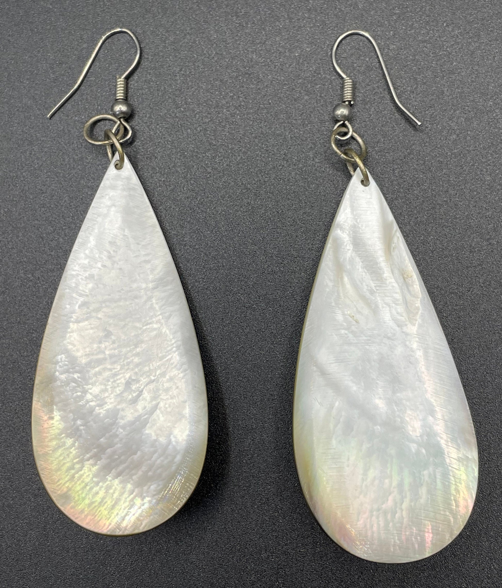 The earrings are about 3 1/4 inches by 1 inch in size and are for pierced ears with silver tone ear hooks. They are in very good vintage condition - the abalone backs and operculum cabochons are natural materials, with naturally occurring bumps, crevices and striations, so please examine all photos for a full condition report.