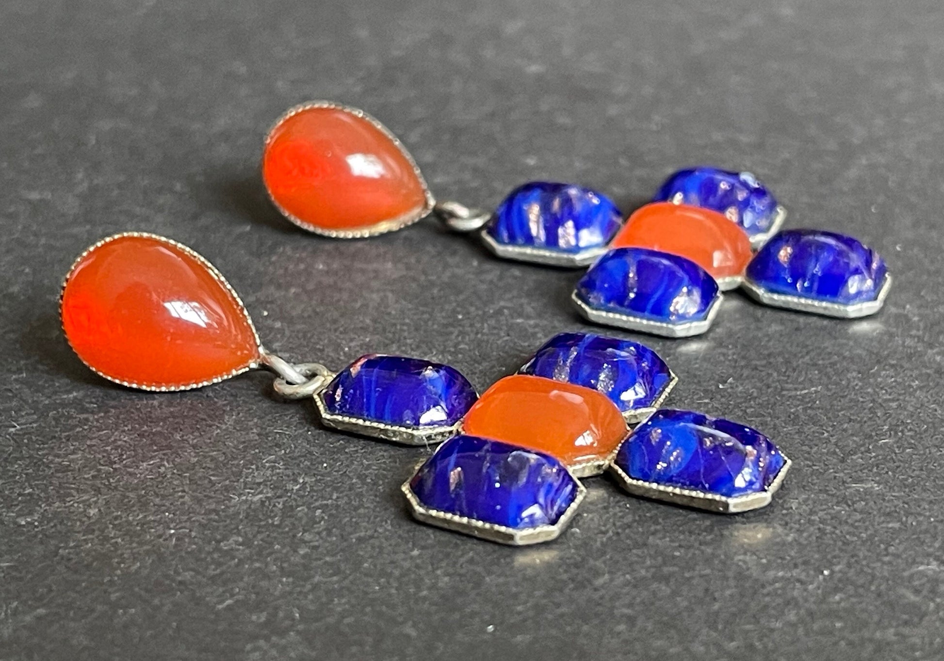 Gorgeous vintage poured glass cabochon earrings in complementary colours lapis lazuli blue and carnelian orange set in silver tone. The earrings are large and make a dramatic statement - measuring 2 inches in length and 1 inch each in width.
