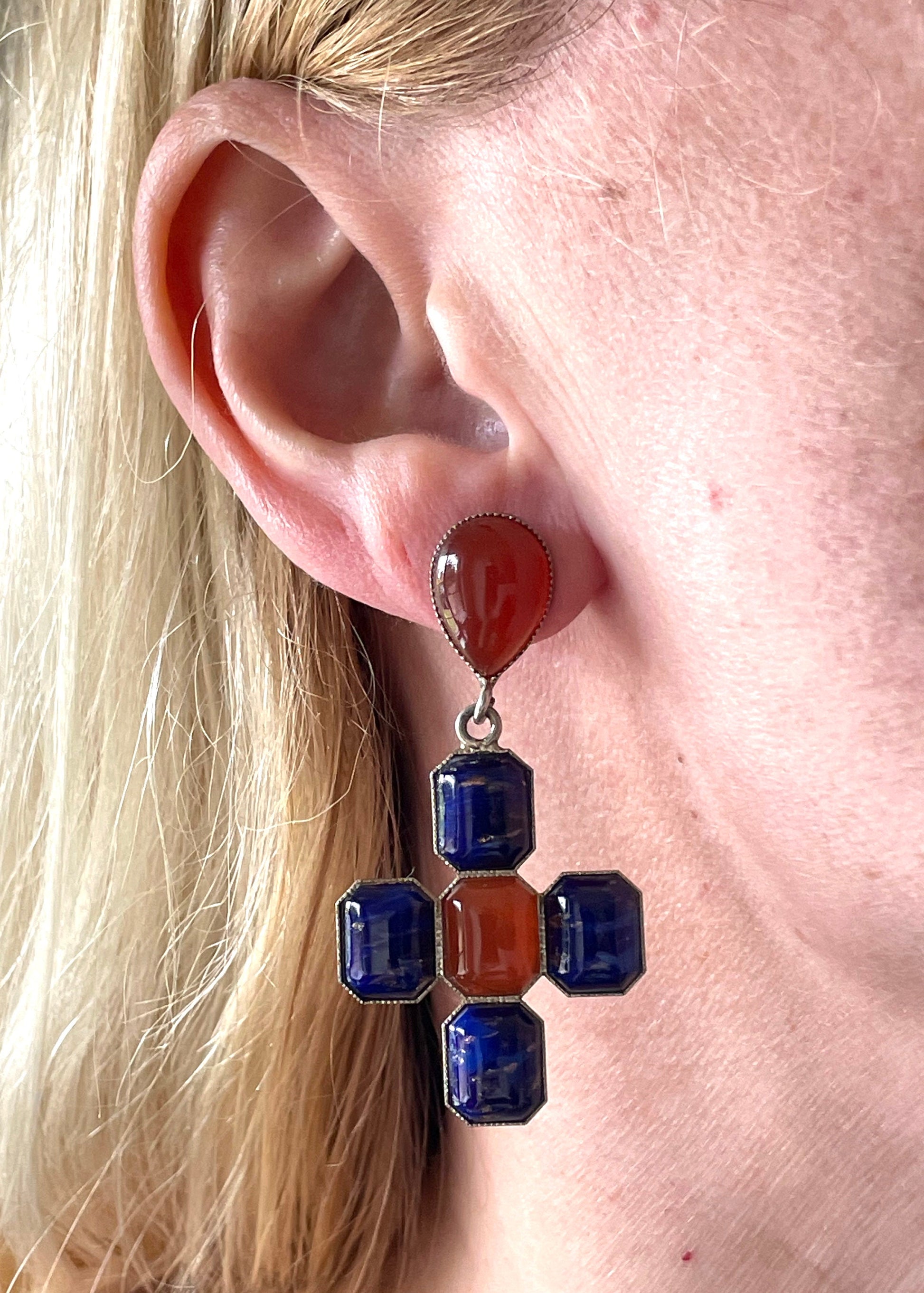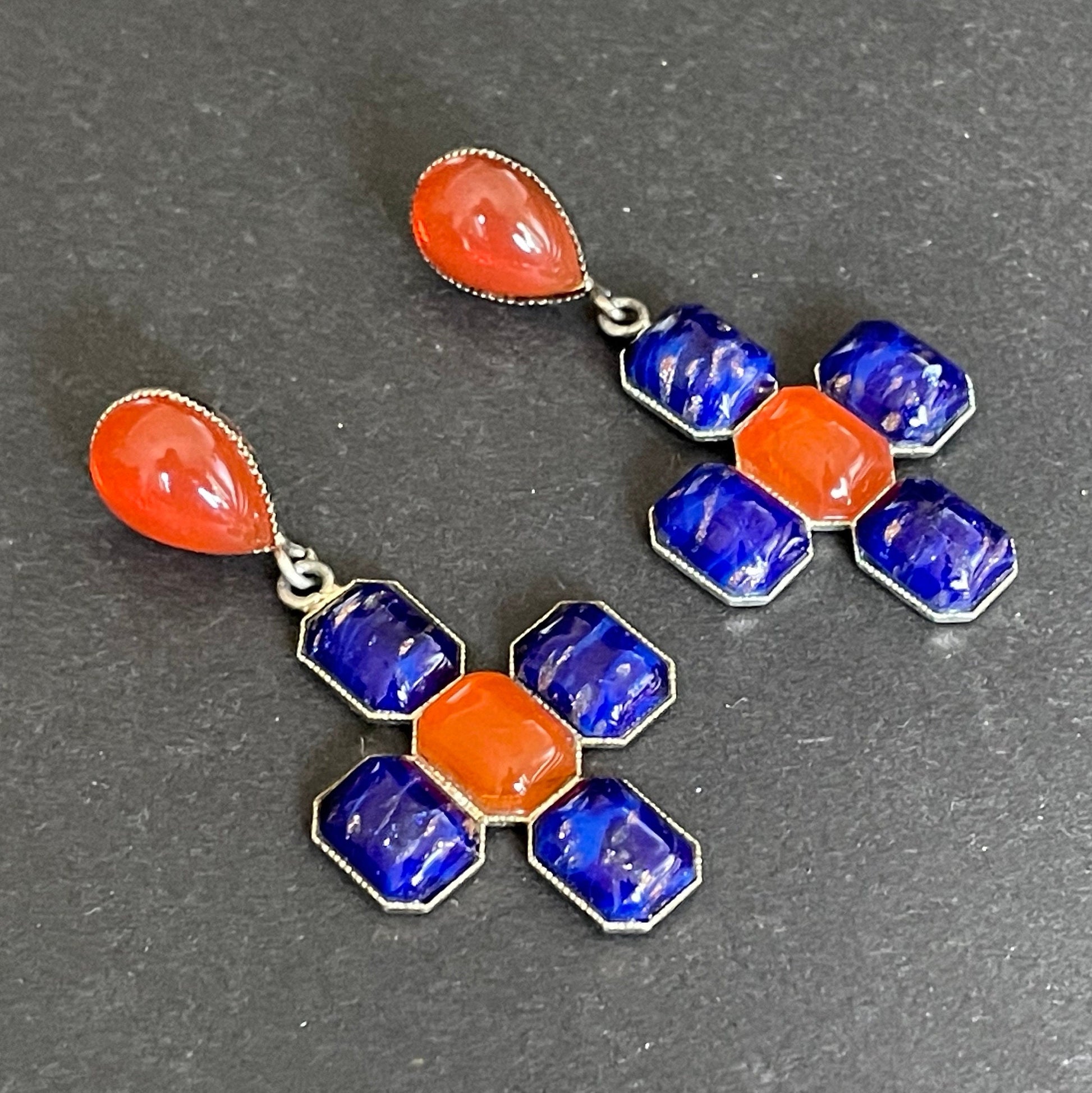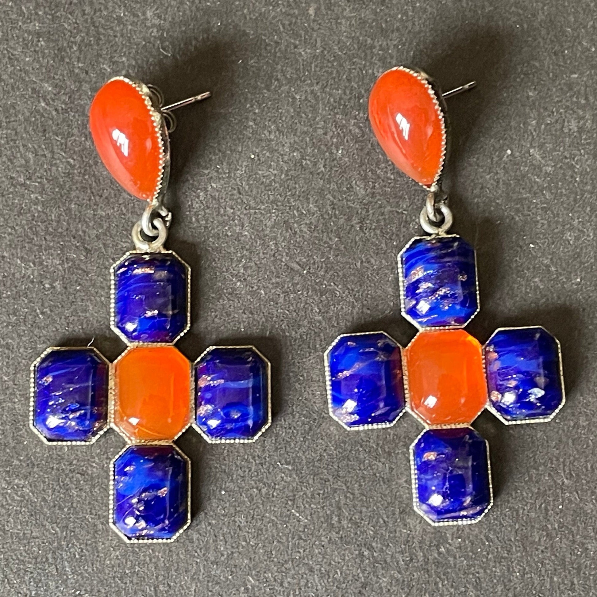Vintage poured glass cabochon faux lapis lazuli deep blue and faux carnelian orange glass earrings with cross motif in silver tone