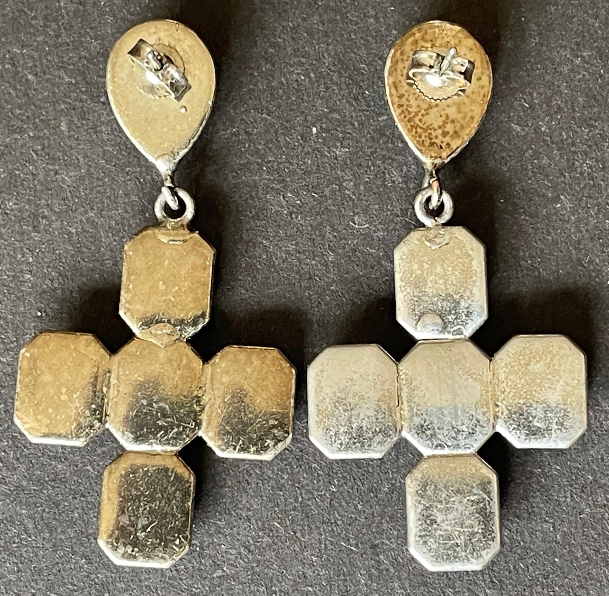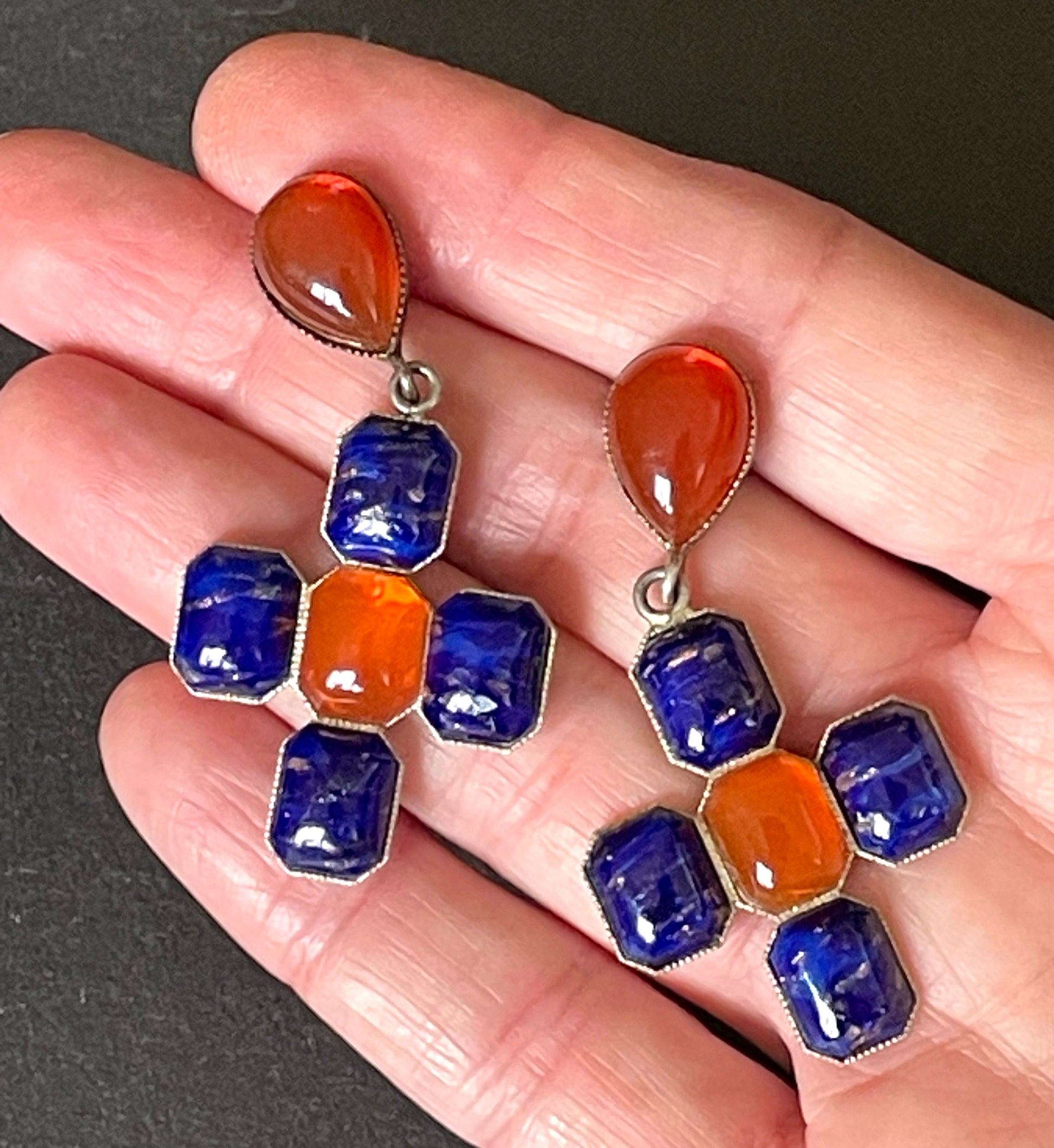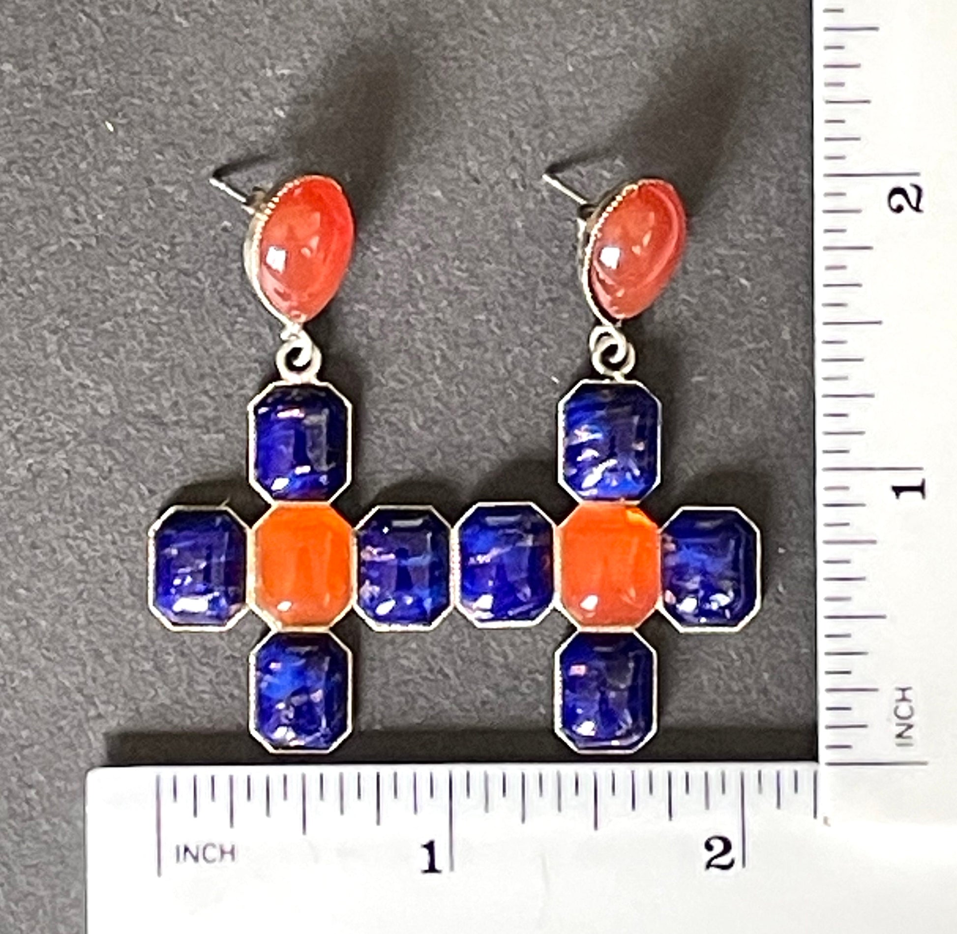 Vintage poured glass cabochon faux lapis lazuli deep blue and faux carnelian orange glass earrings with cross motif in silver tone