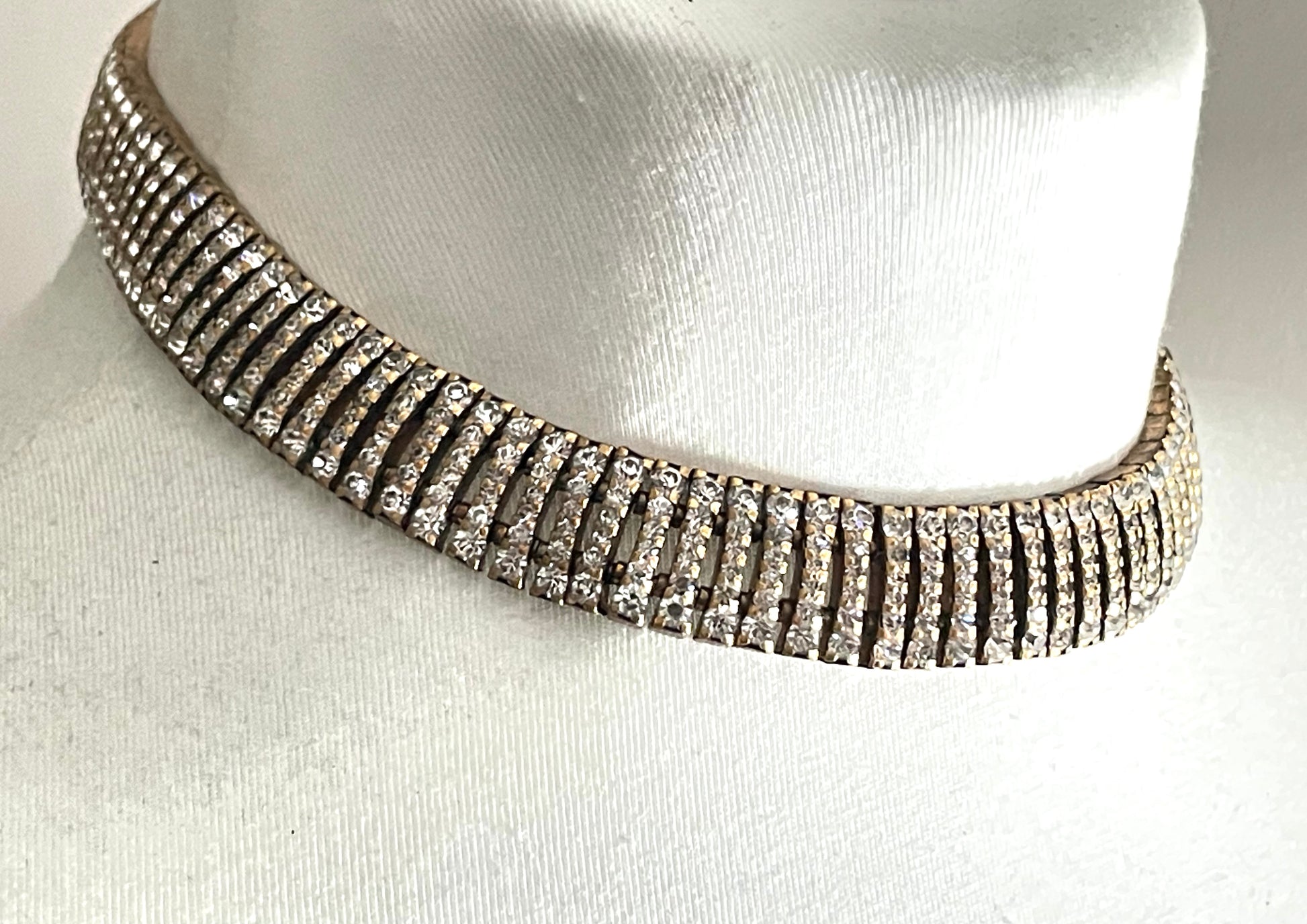 Vintage Schreiber and Hiller Art Deco clear paste rhinestone and gold tone choker cocktail necklace (unsigned)