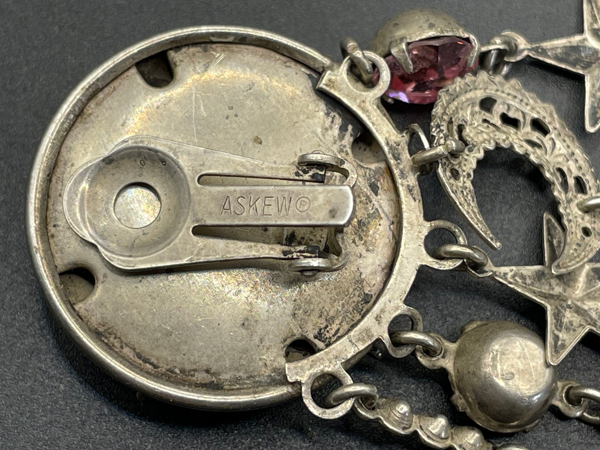 Fabulous vintage and highly collectable signed Askew London statement earrings in antiqued silver tone with aurora borealis and pink, green and blue rhinestone accents on dangling chandelier strands. It has a gorgeous celestial design with stars, filigree crescent moons and decorative drops - absolutely stunning.