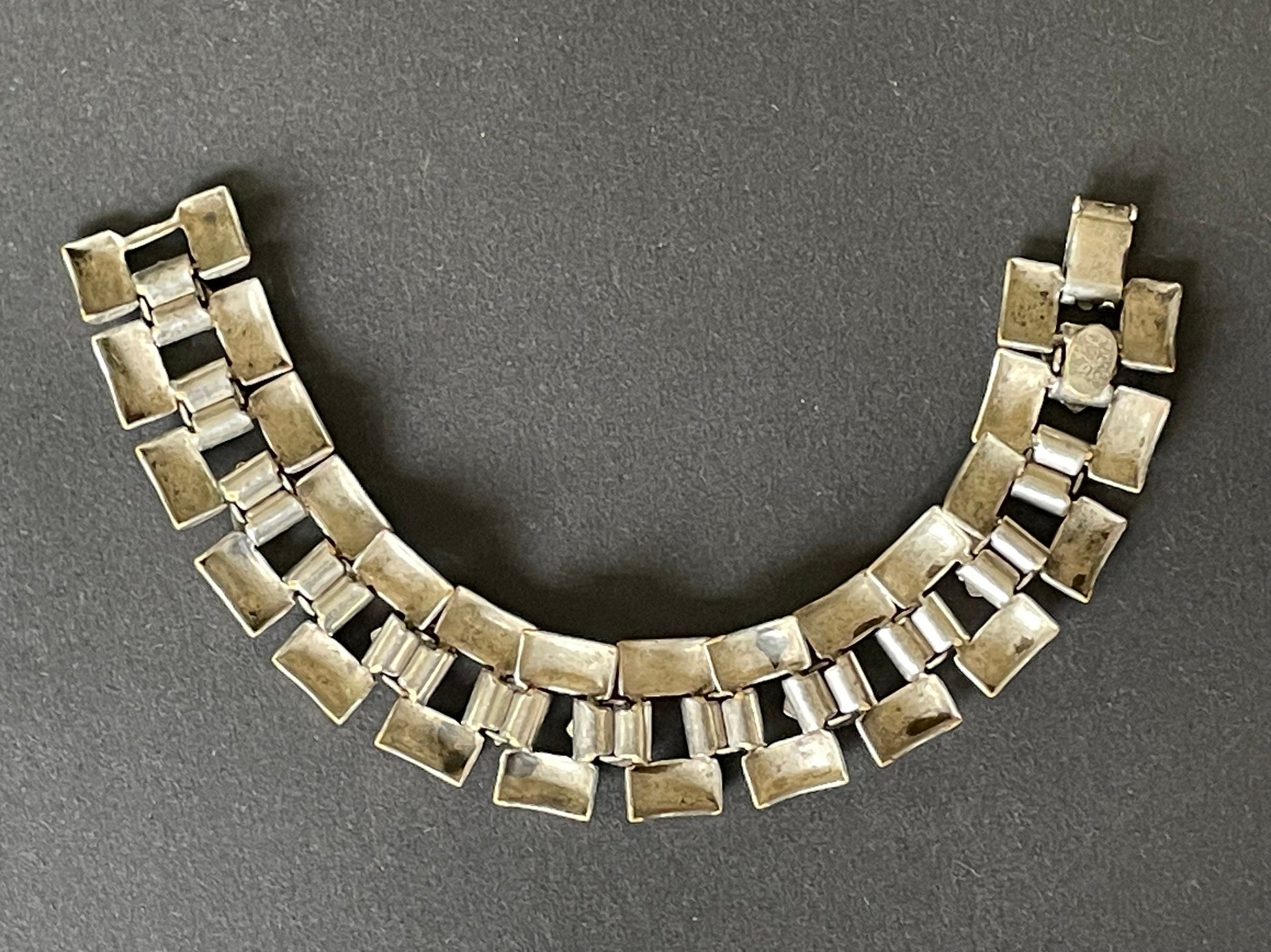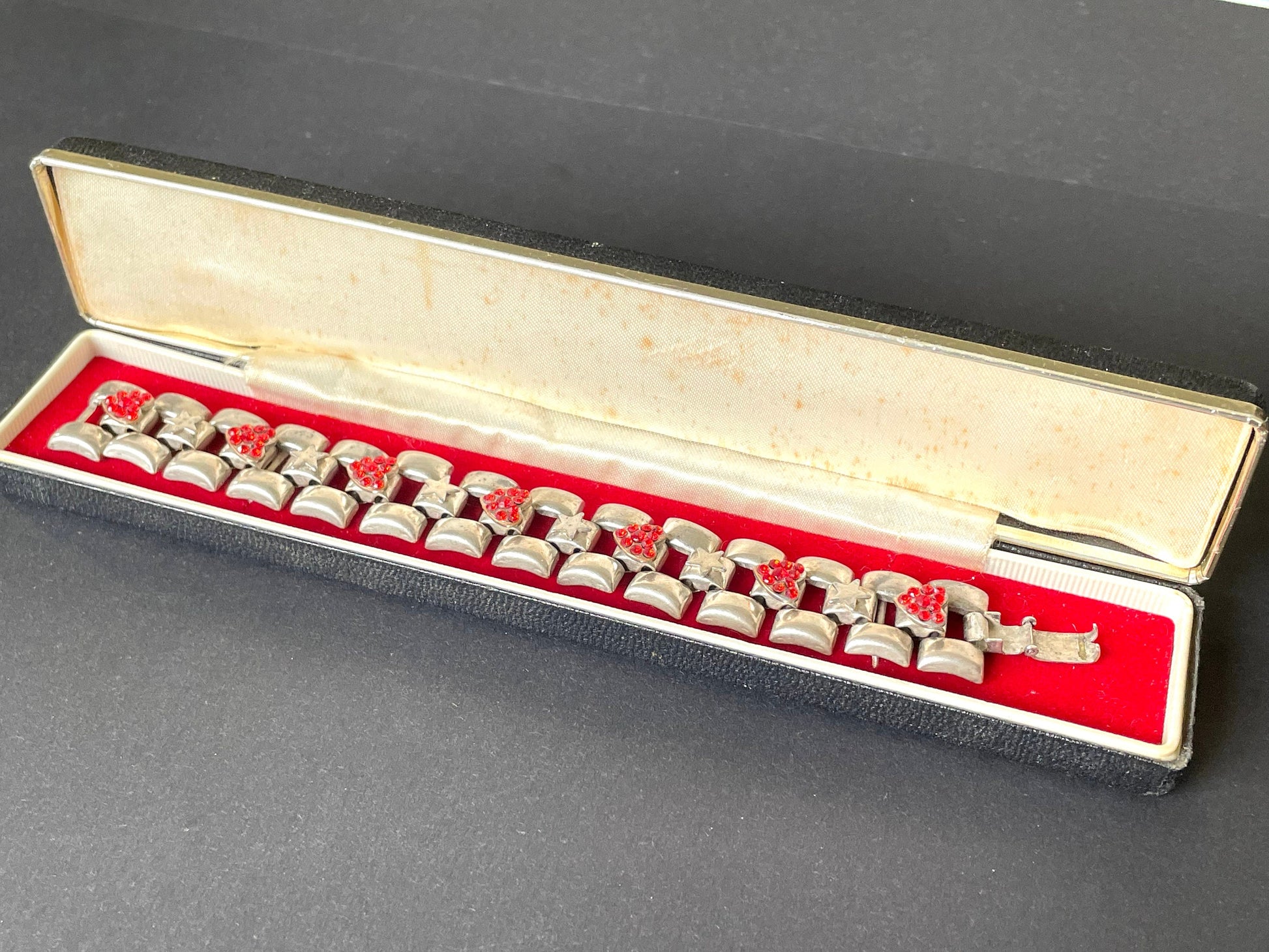 Fabulous vintage and highly collectable Askew London wide panel bracelet. This piece has an Art Deco machine age construction with tank track articulated panels. The panels are decorated with hearts and stars - the hearts encrusted with bright red rhinestones. On panel has the signature plaque on the reverse, signed Askew London.