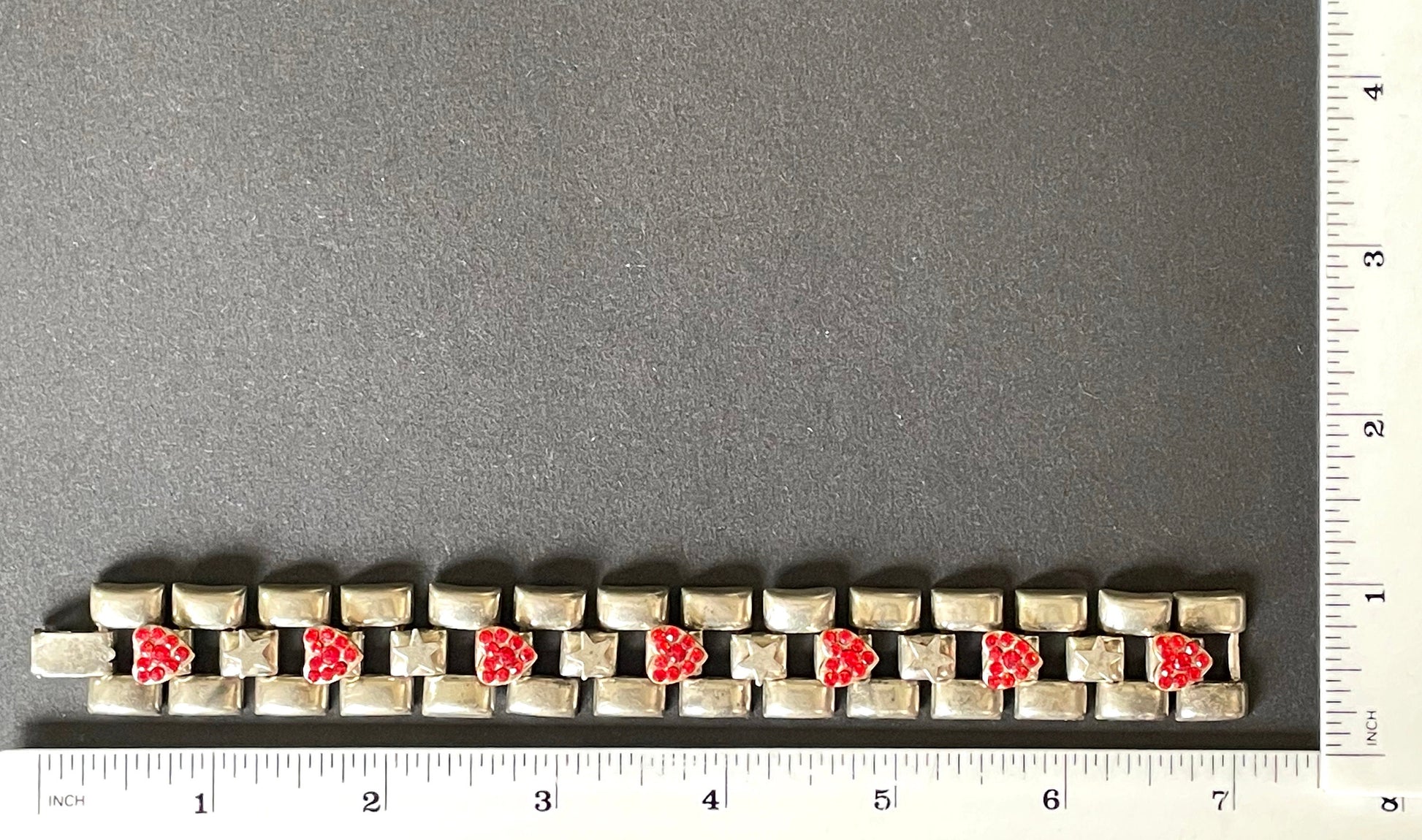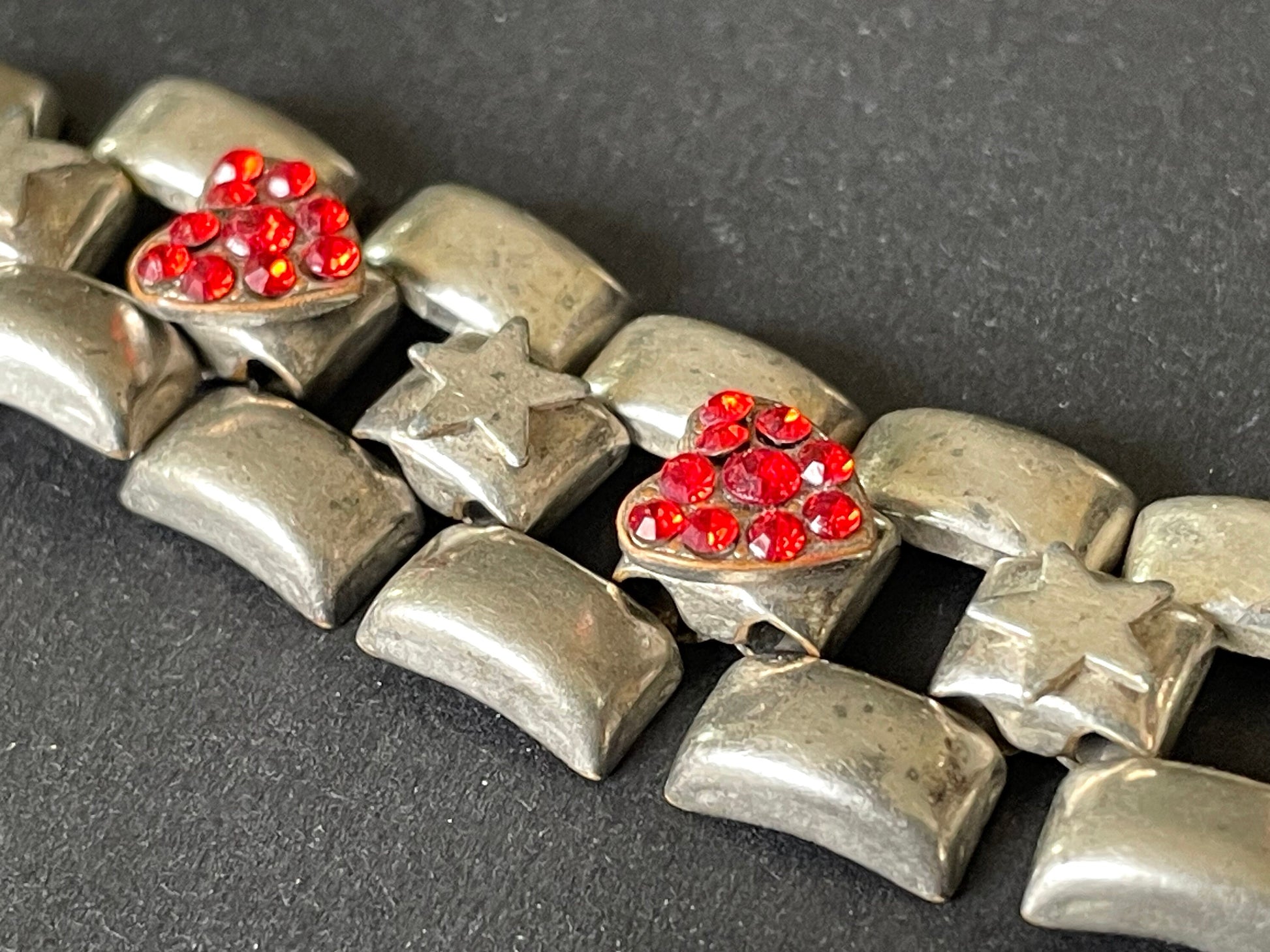 Vintage signed Askew London red rhinestone heart and star tank track panel bracelet in antique silver tone