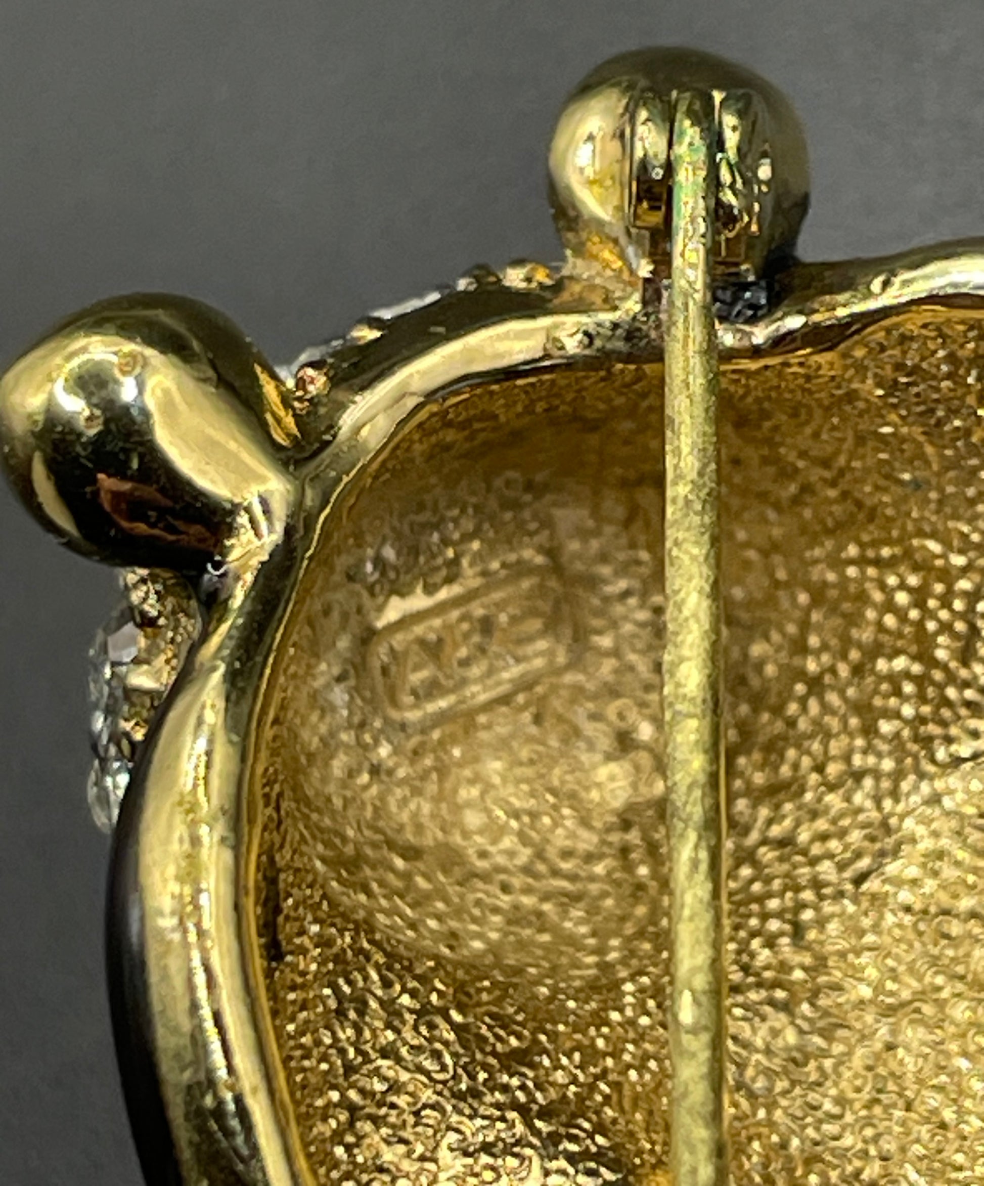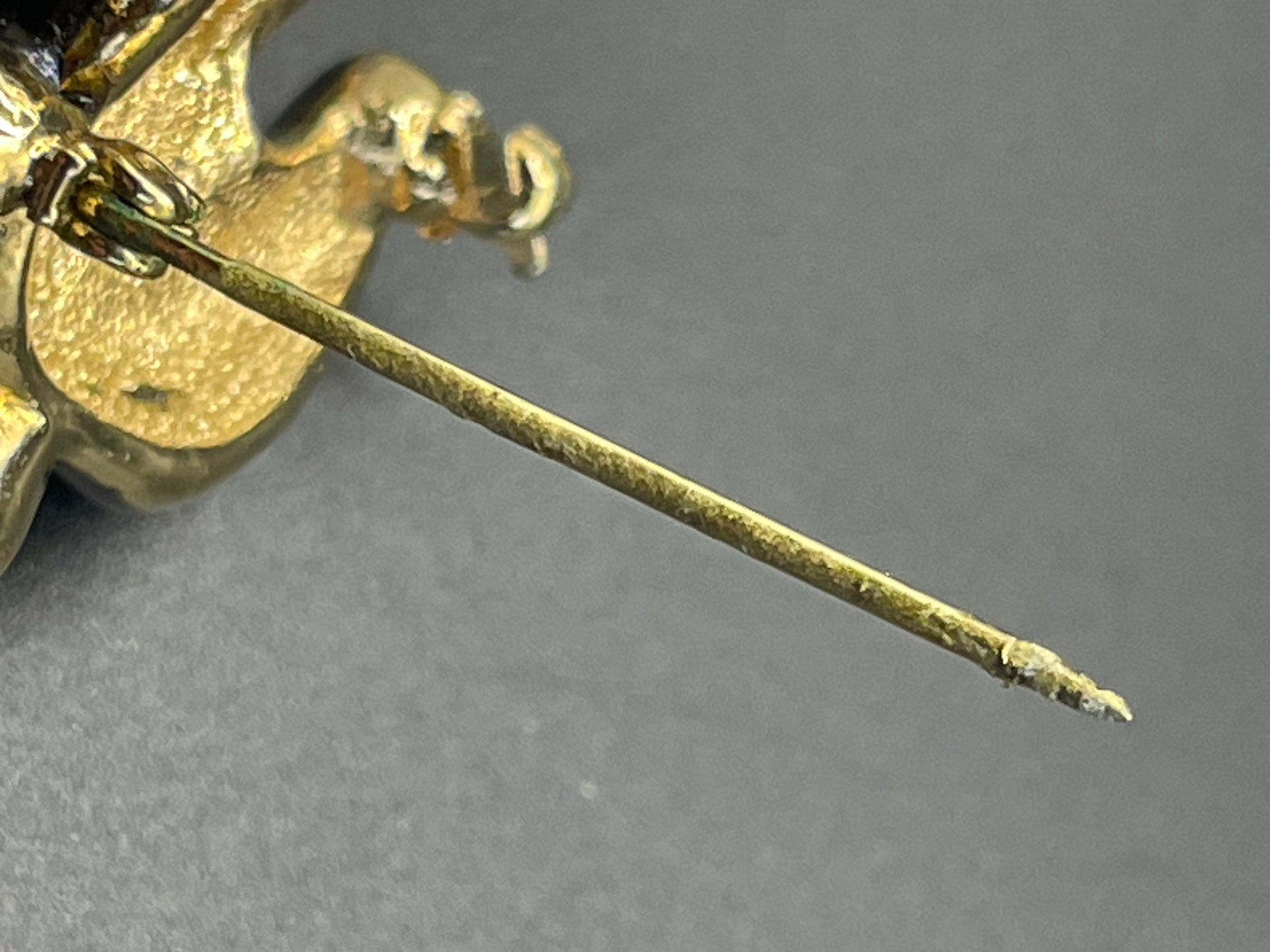 It is about 1 1/4 inches long and 1 1/4 inches wide. It fastens with a secure and fully functioning roll-over clasp and pin. The vintage condition is very good over the whole body of the brooch, but the pin has some wear. Please see the close-up pictures of the pin - it works perfectly but the gold plating seems a little worn and slightly rough.