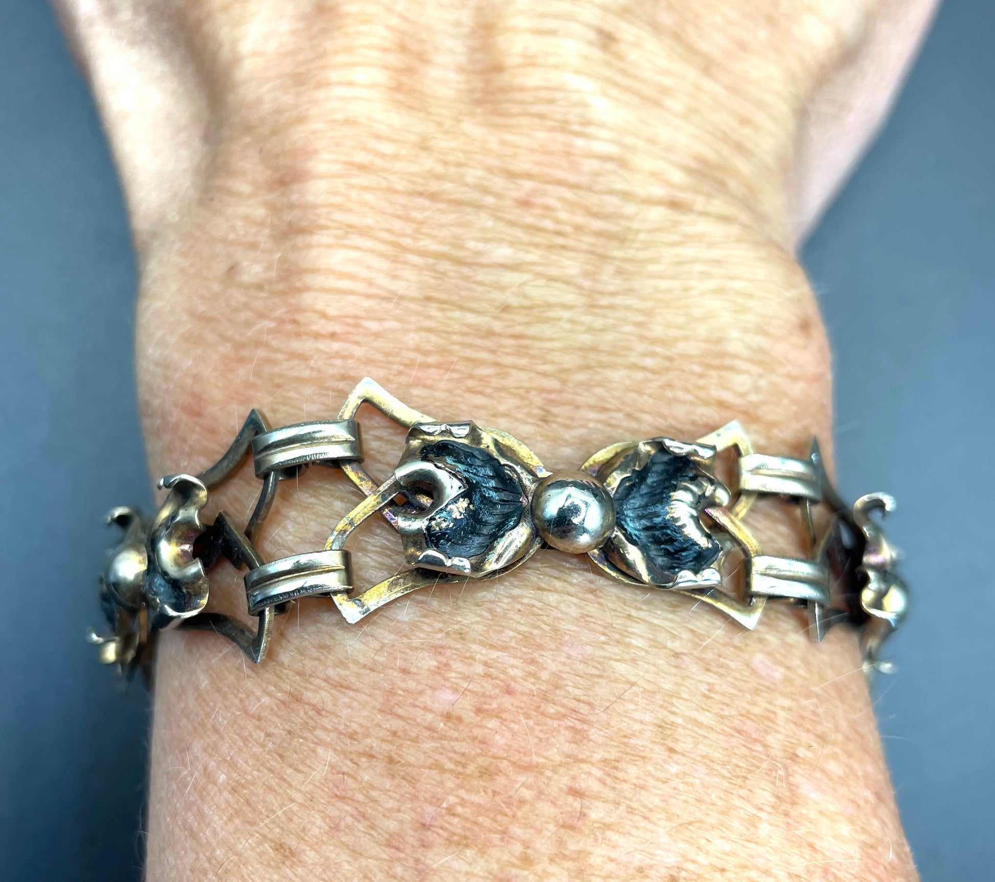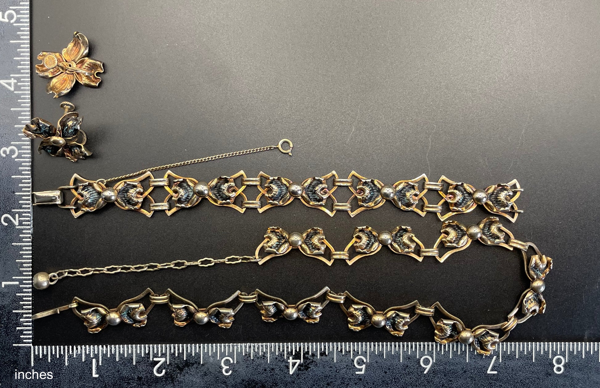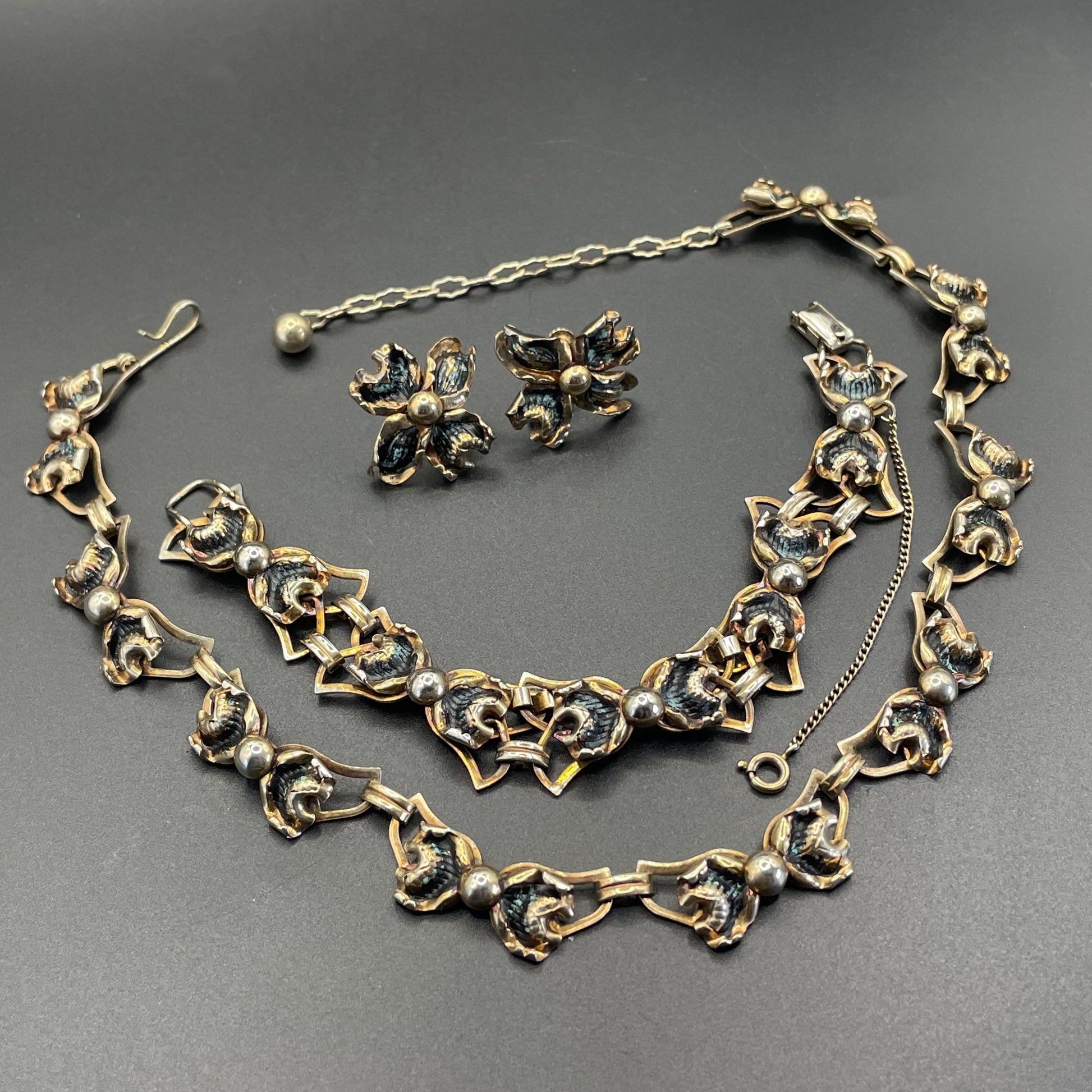 Vintage signed Bond Boyd sterling silver gilt and enamel necklace, bracelet and screw-back earrings parure set, 47 grams overall