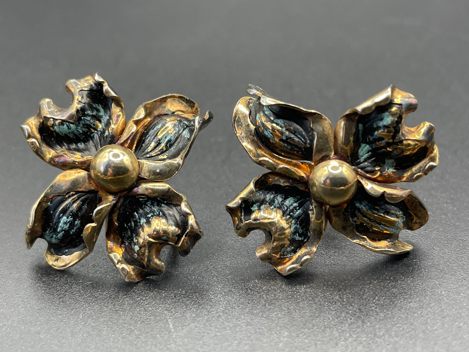 The set is in very good vintage condition. The hand-painted enamel in shades of teal blue on each flower is in pretty good condition, intentionally applied unevenly in an organic design. The set weighs 47 grams altogether.