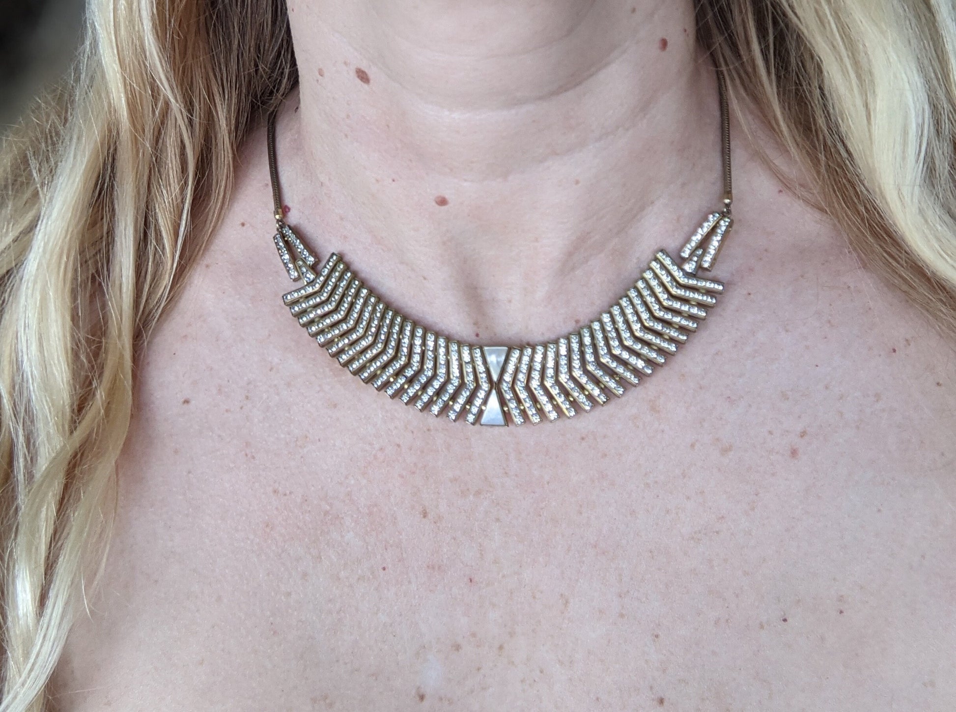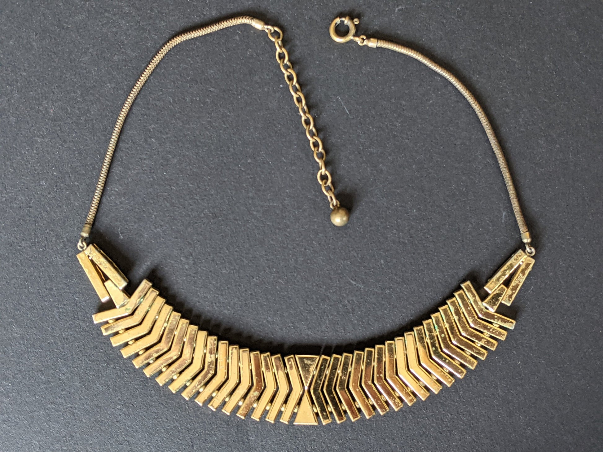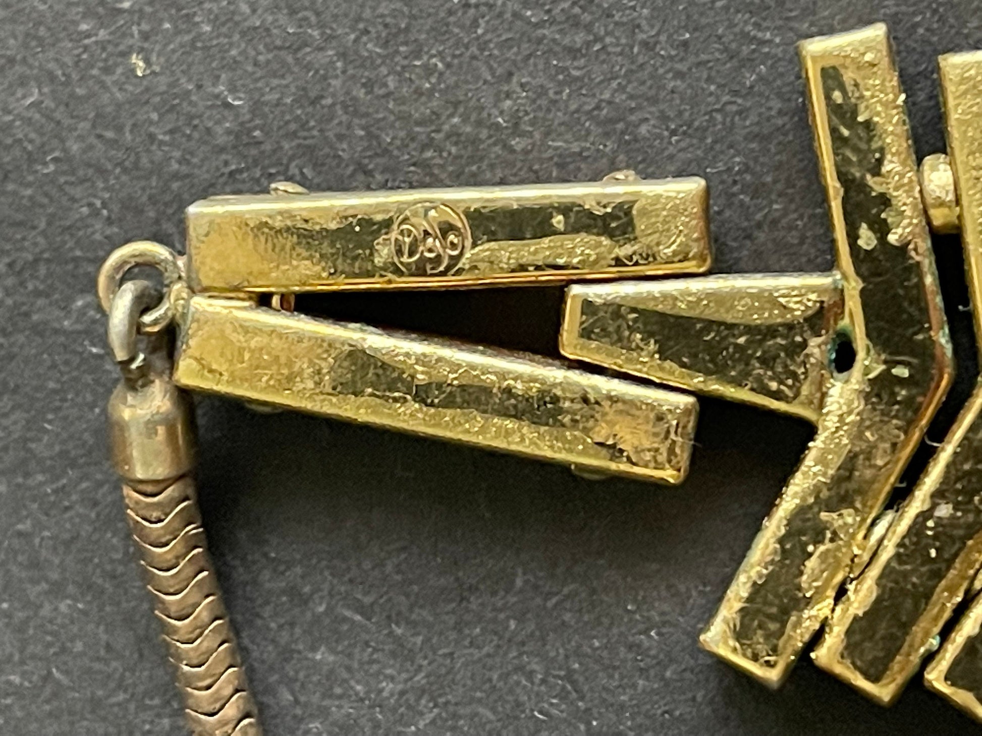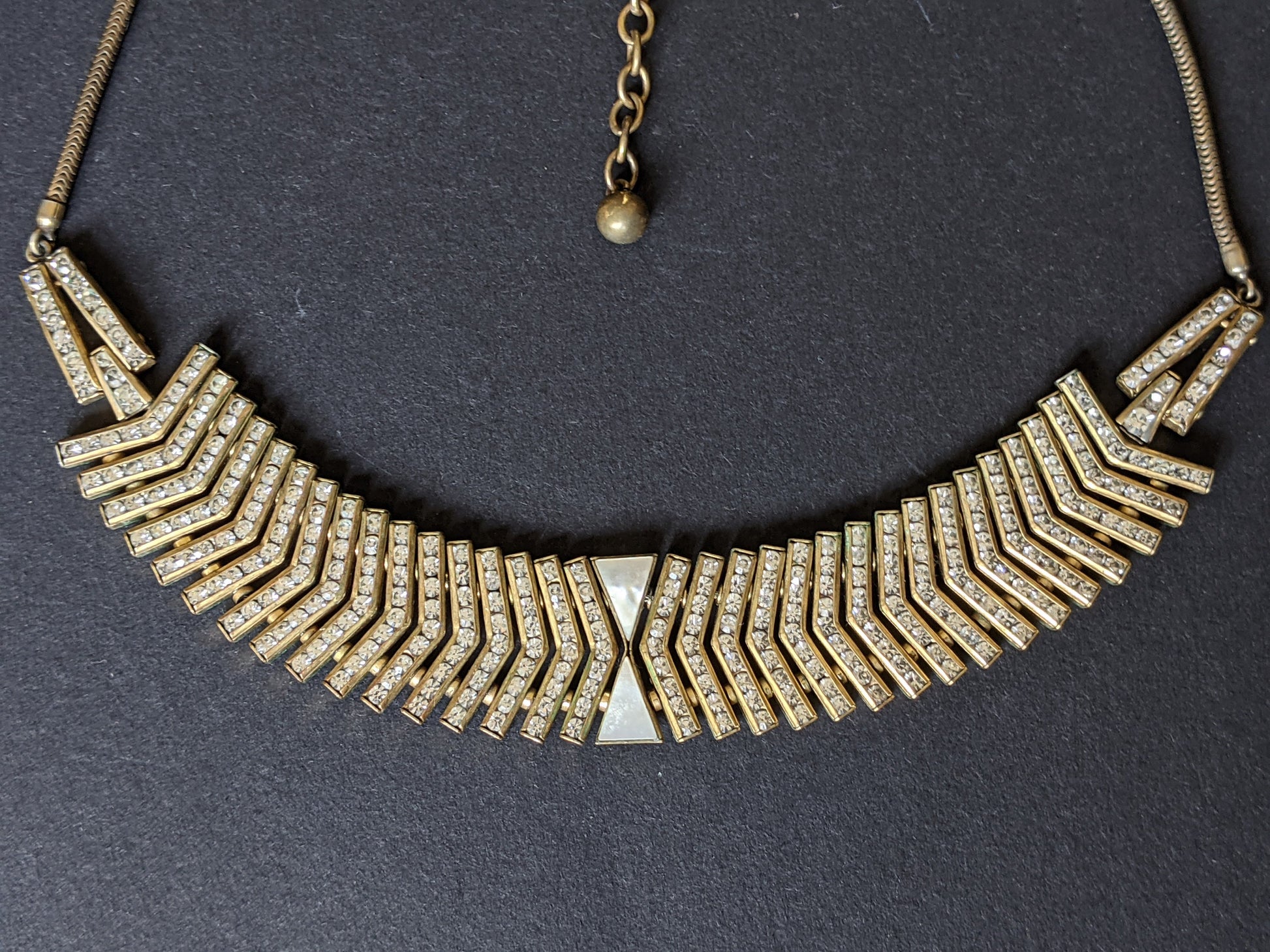 Vintage signed DoSo ( Esha Randel / Schreiber & Hiller ) Art Deco paste rhinestone and mother of pearl gilt geometric machine age necklace