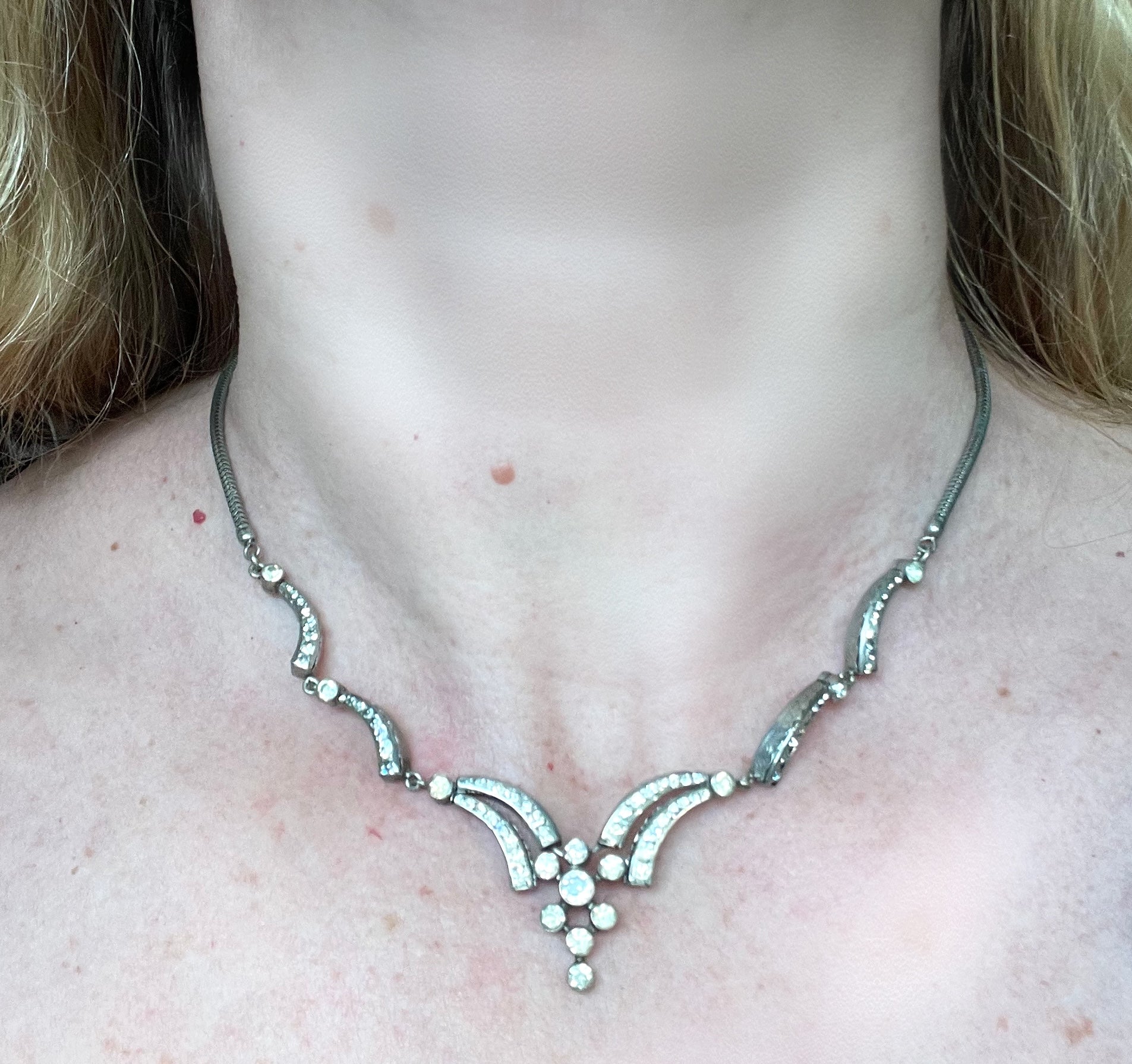 Made by Schreiber and Hiller in Germany as we now know, these pieces are beautifully and intricately engineered. The snake-like links and machine age chain links follow the curves of the neckline and feel comfortable to wear. These pieces are not stamped or signed but are very recognisable as pieces by Schreiber and Hiller who patented this construction method.