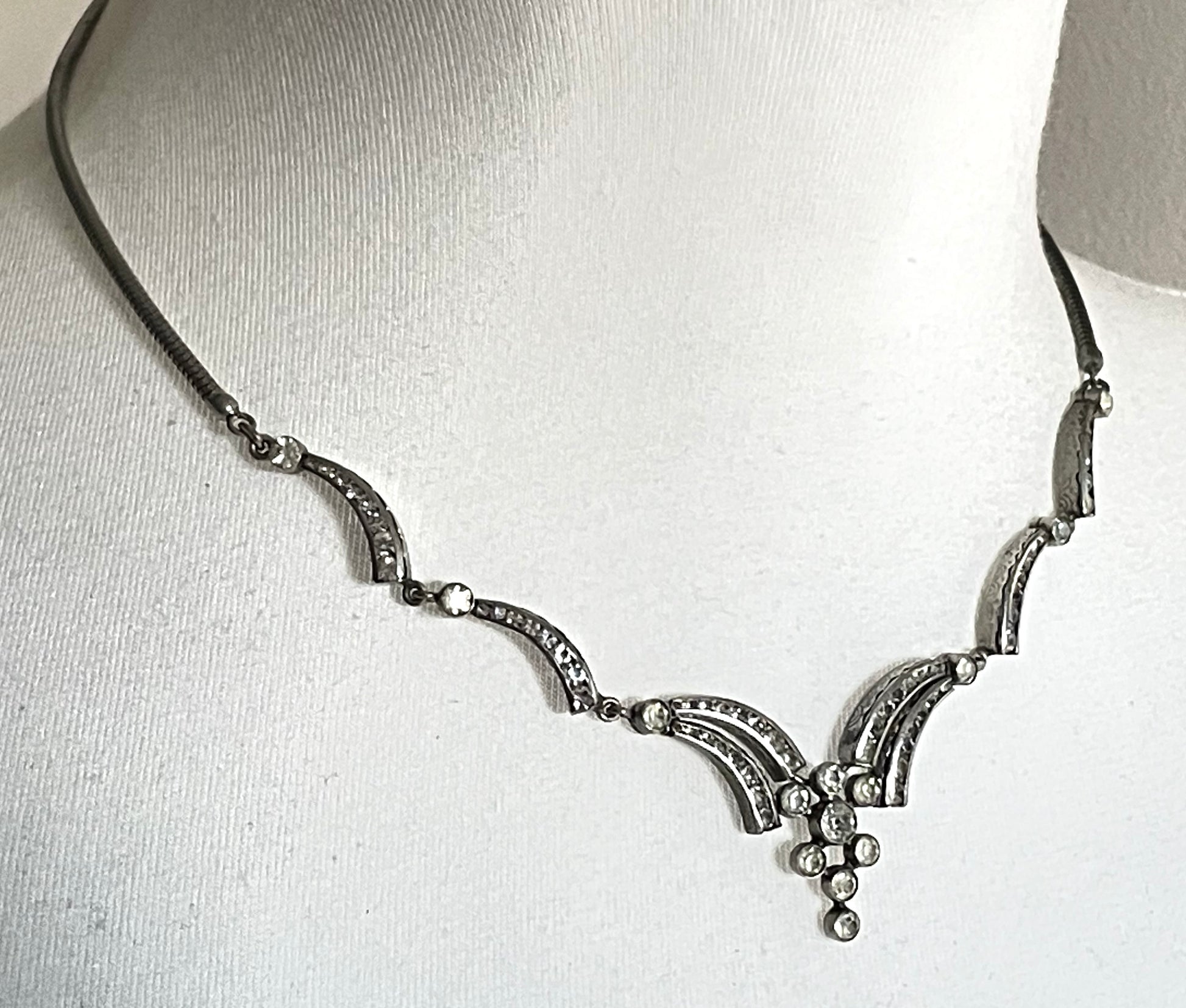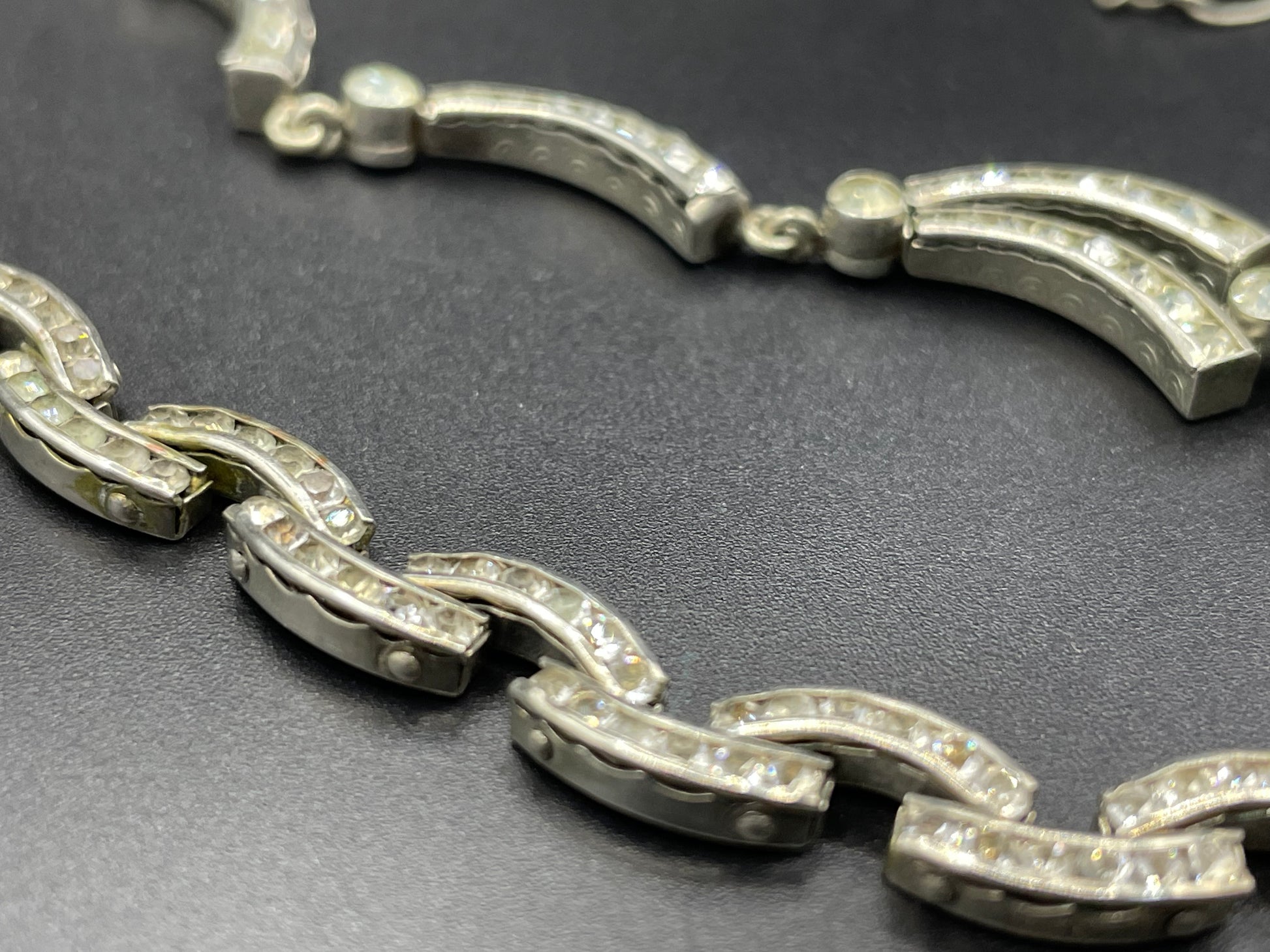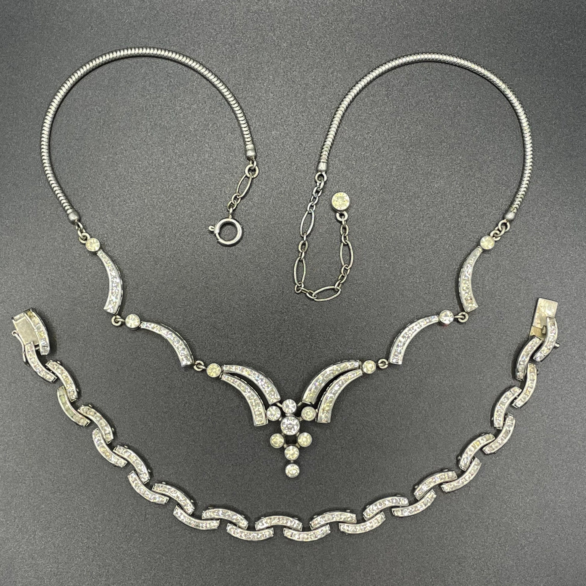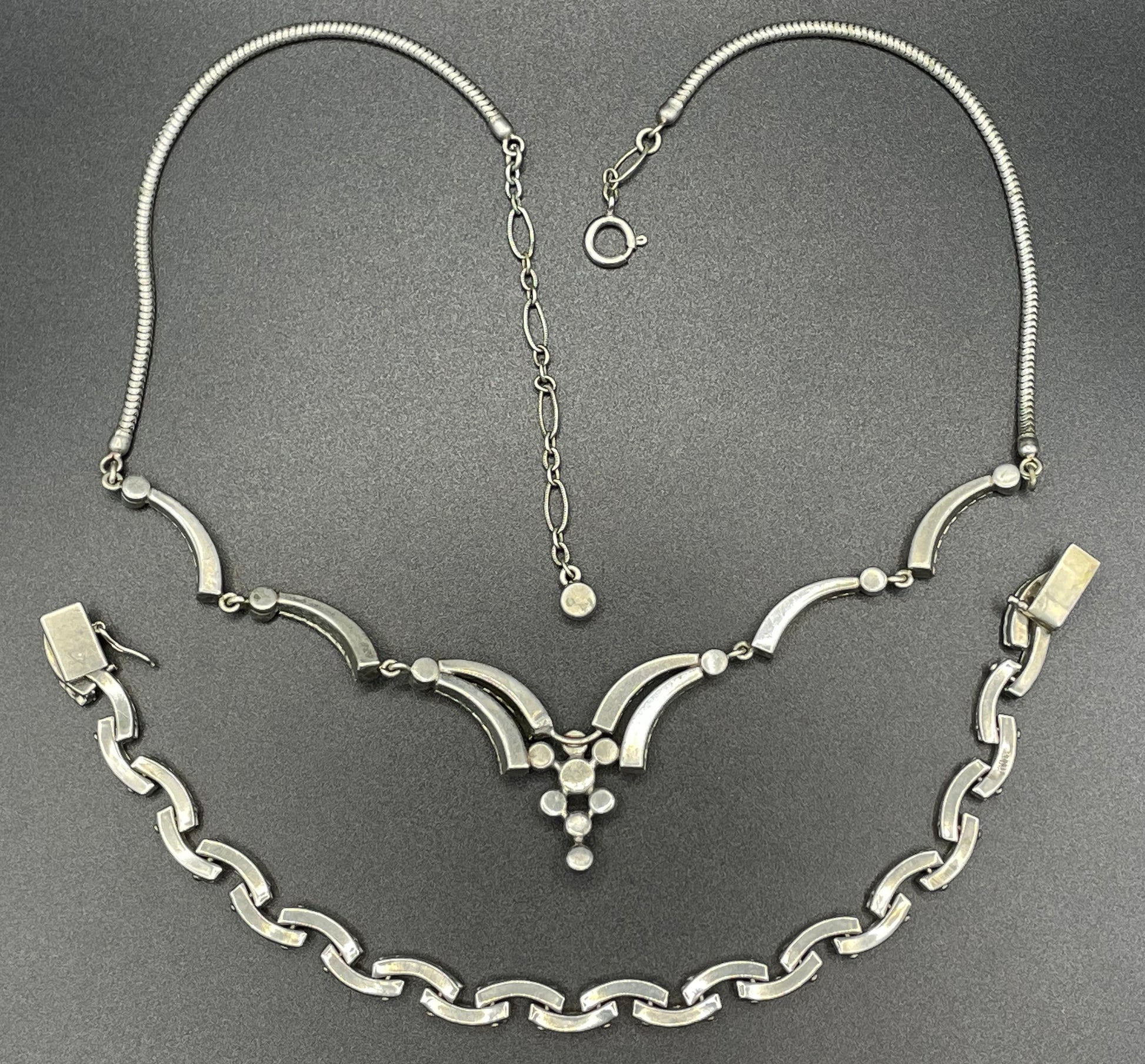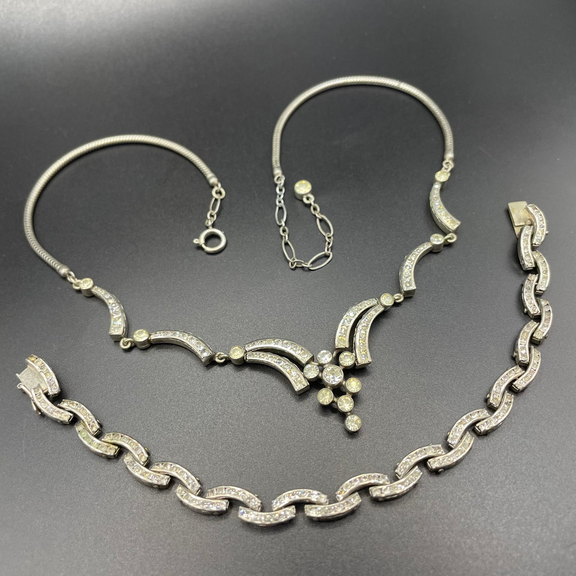 Vintage unsigned DRGM Schreiber & Hiller Art Deco paste channel set clear rhinestone and silver tone necklace and bracelet set