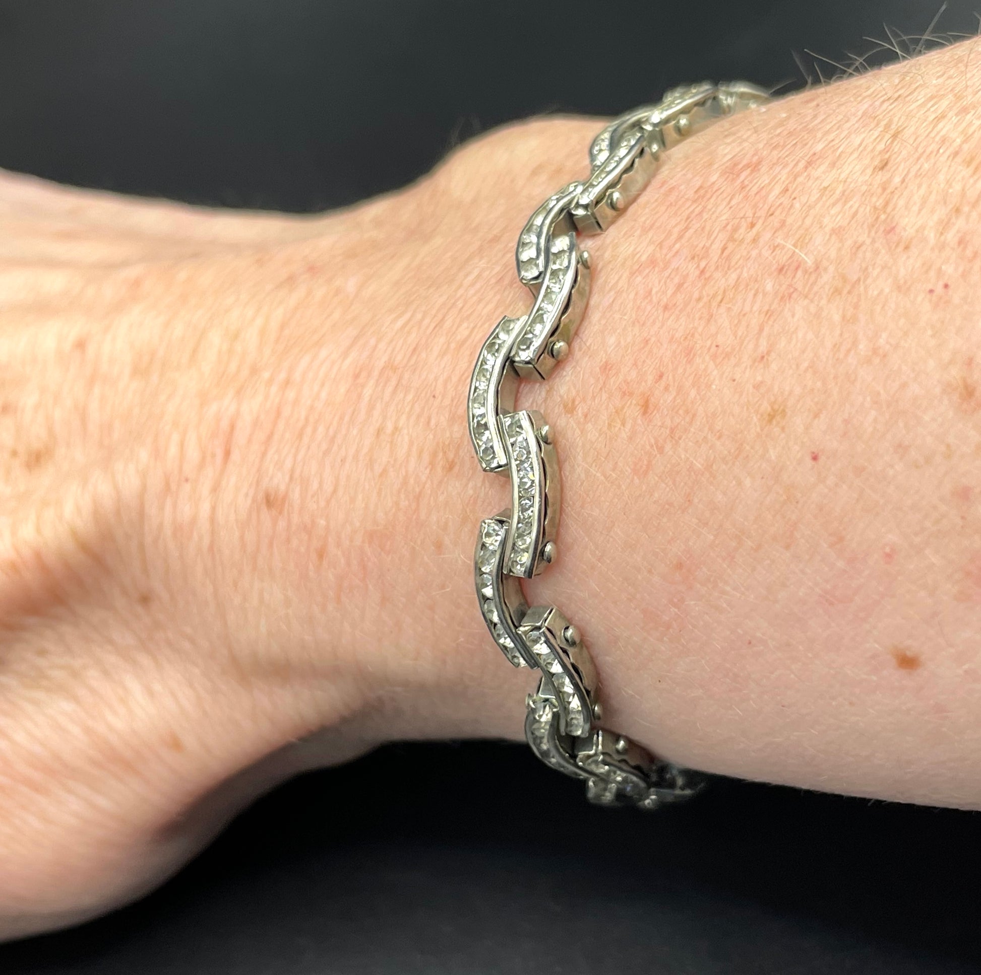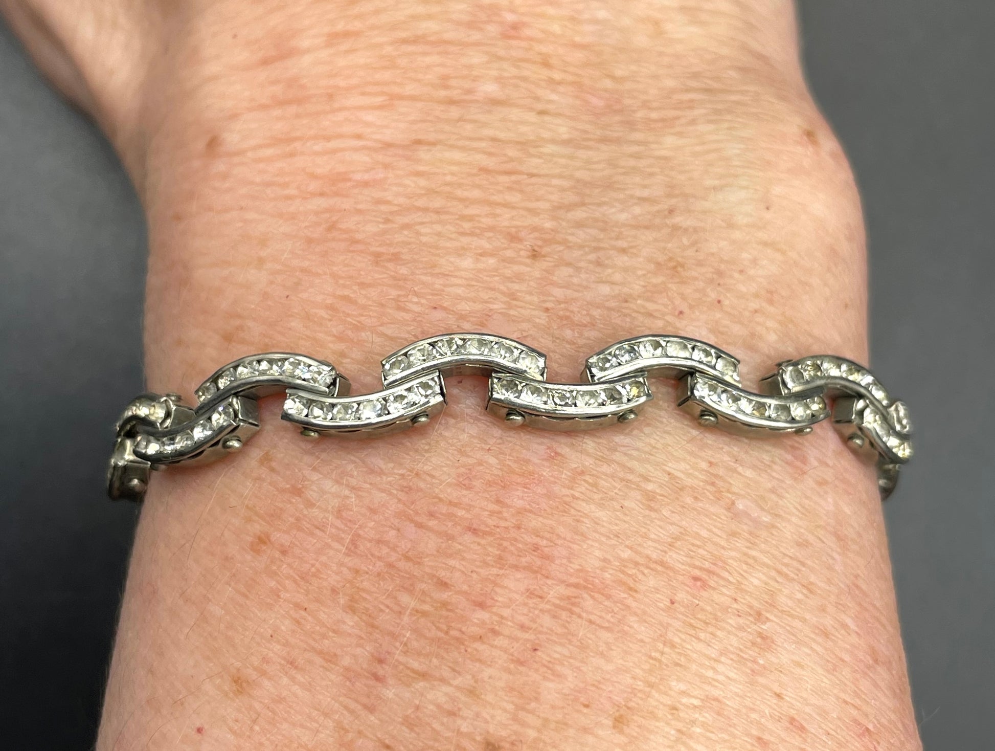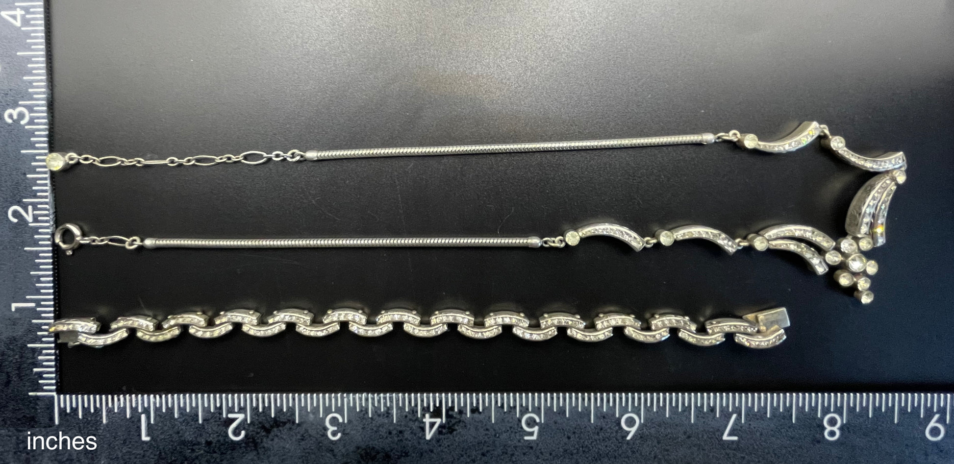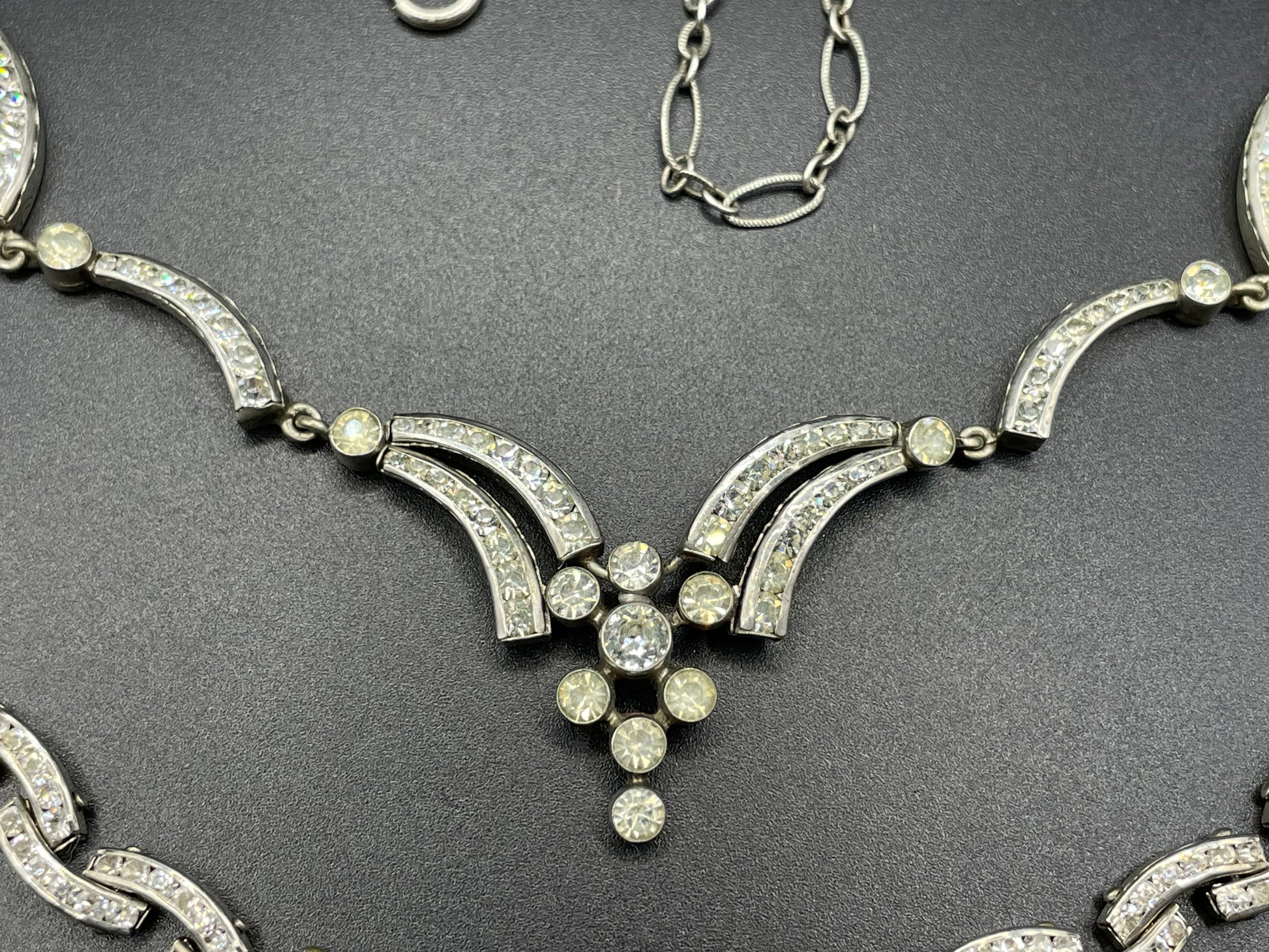 Wonderful vintage Art Deco Schreiber & Hiller necklace and bracelet set in silver tone with gorgeous geometric design and scores of clear rhinestones. The panels have channel set rhinestones using the method patented by Schreiber and Hiller in the 1930s. These designs are very unusual from the vast range of Schreiber and hiller designs I have seen.