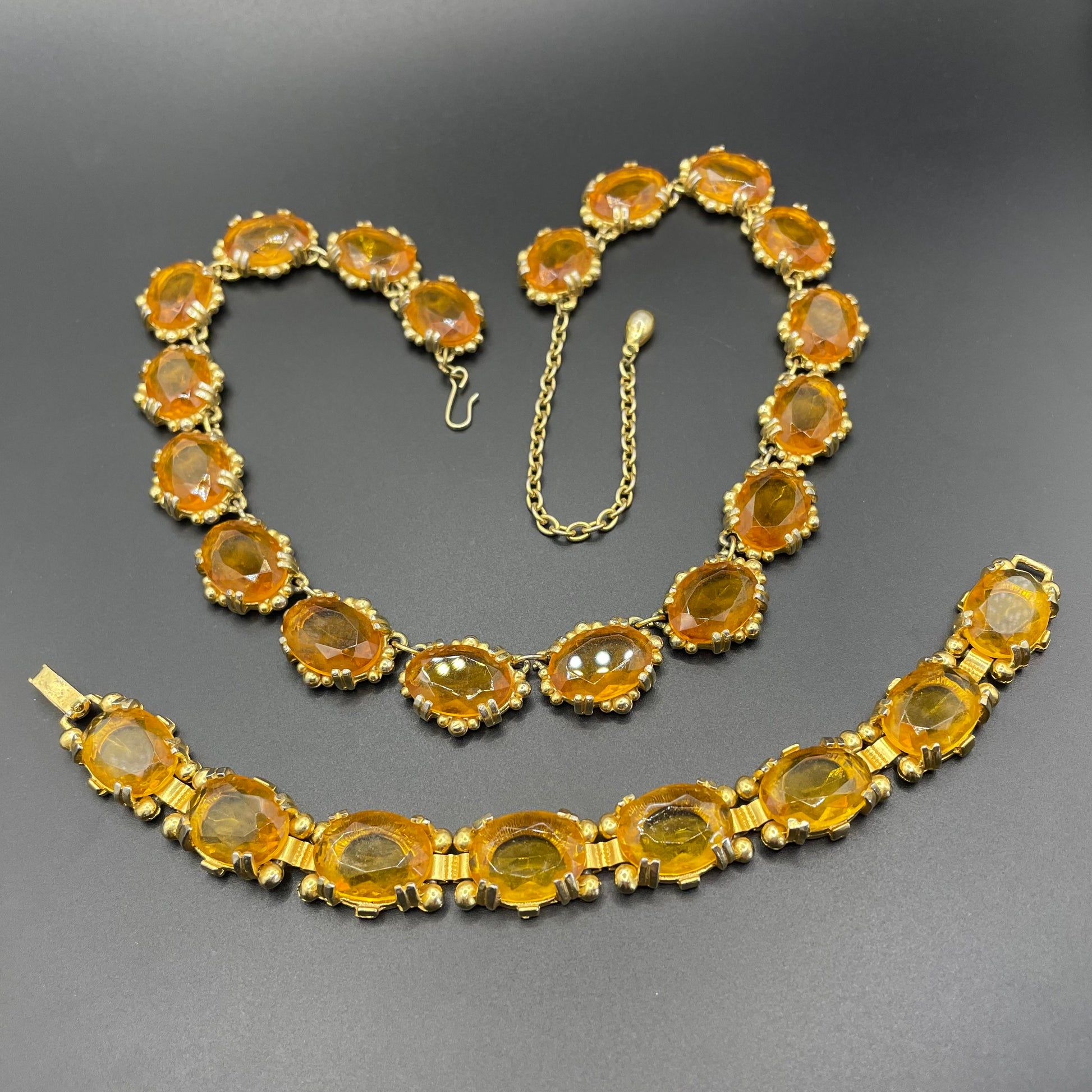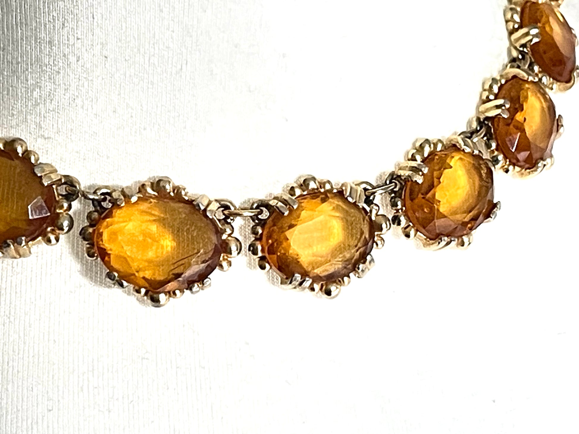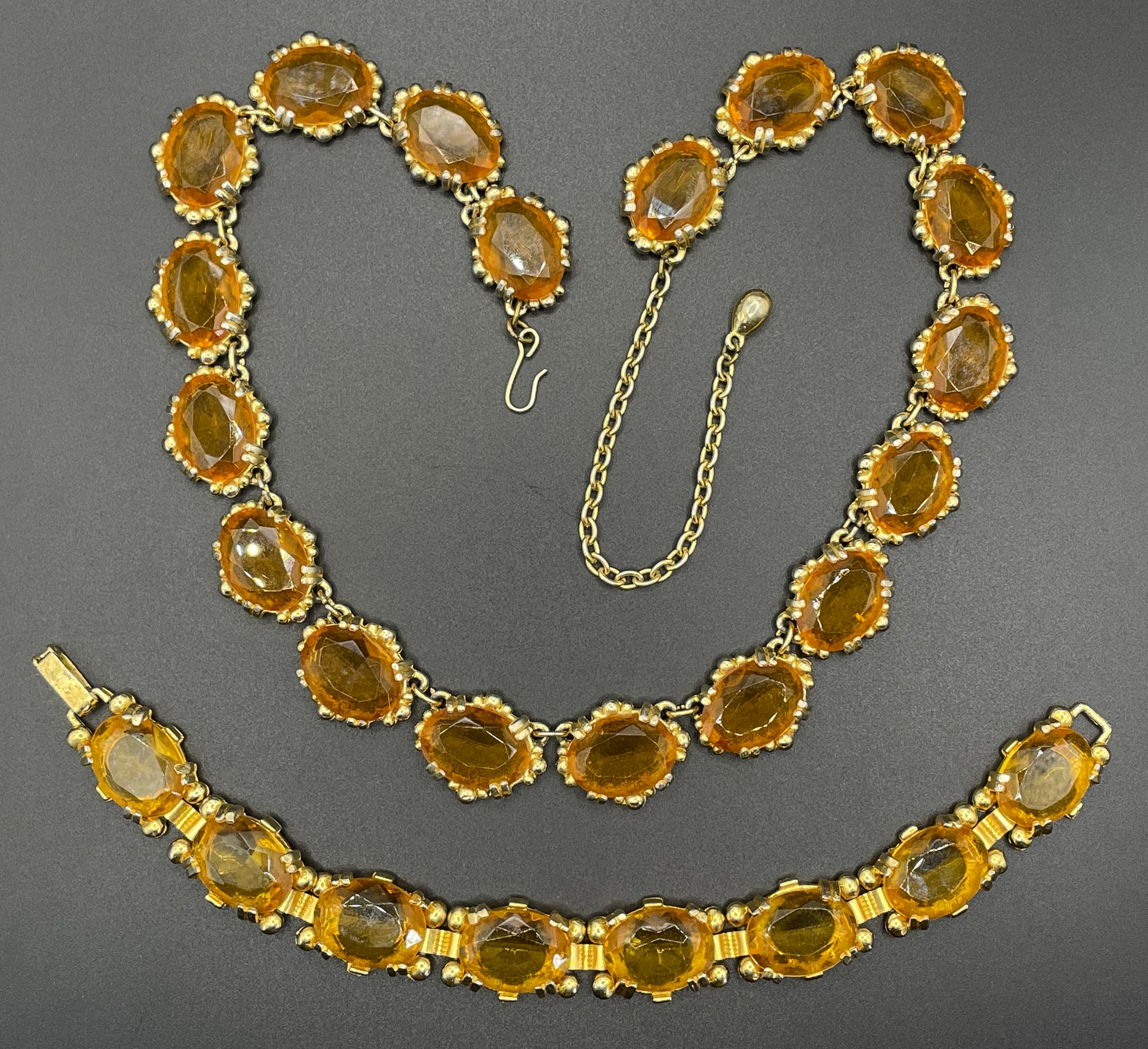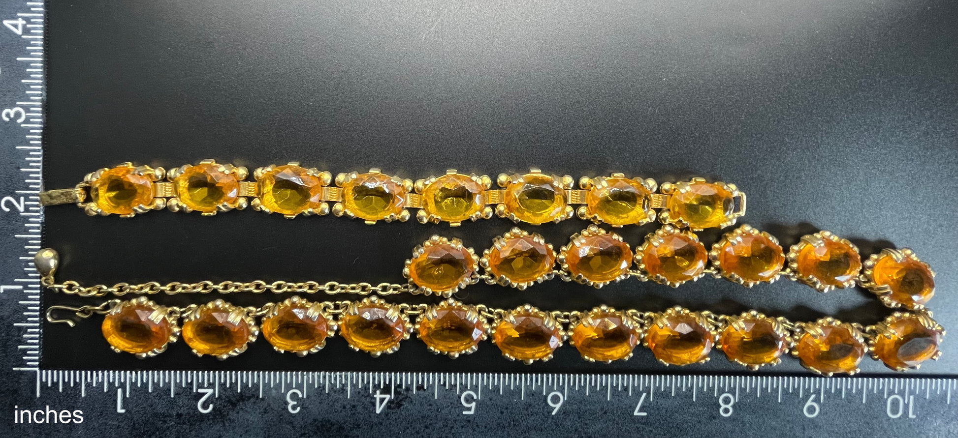 Vintage Sphinx orange citrine / topaz glass riviere necklace and bracelet set, heavy, bezel set, open-backed stones in ornate settings