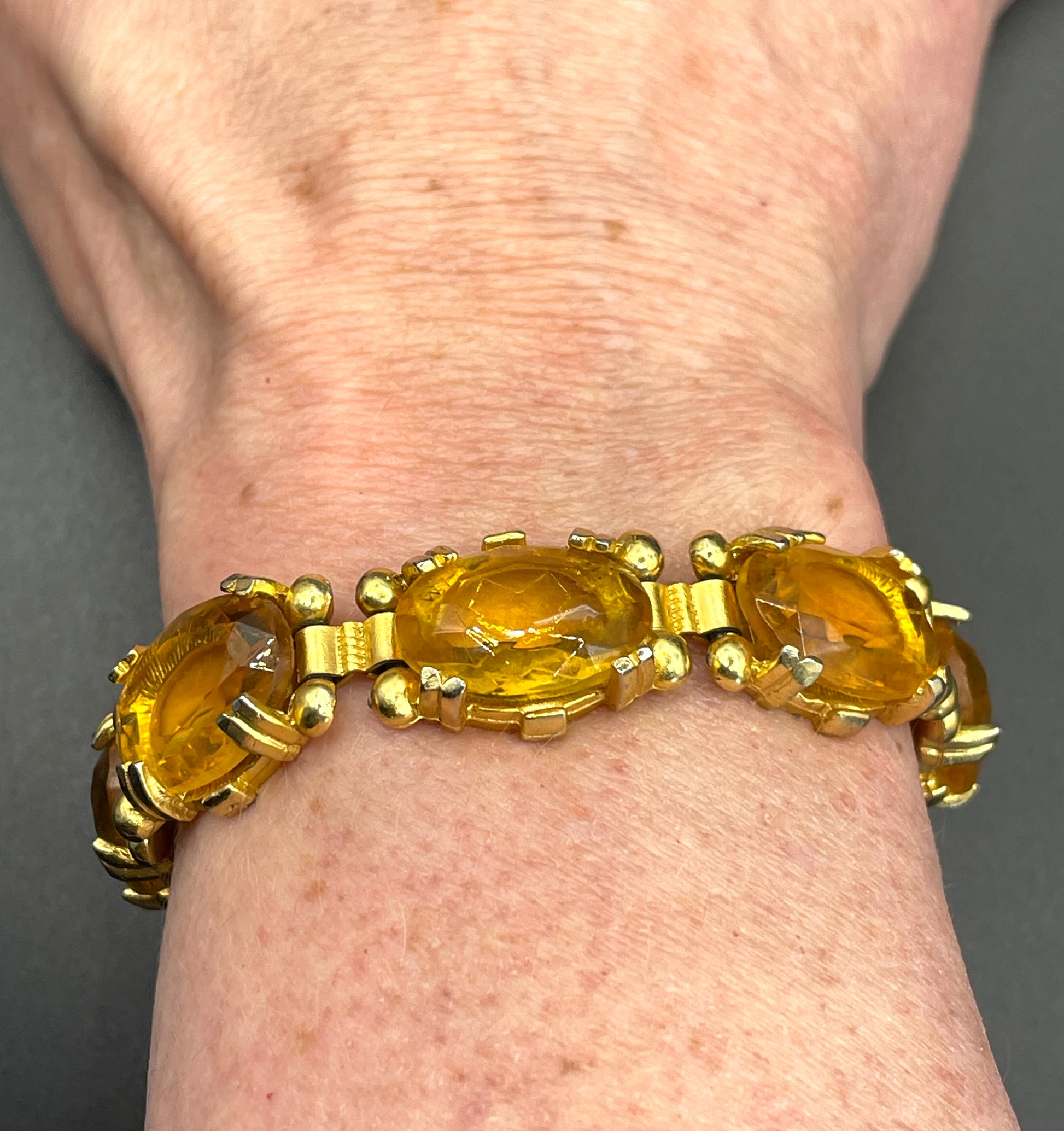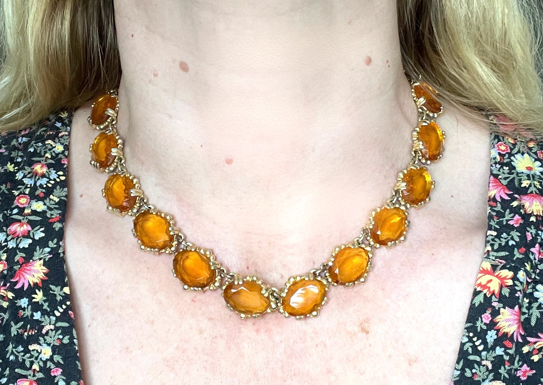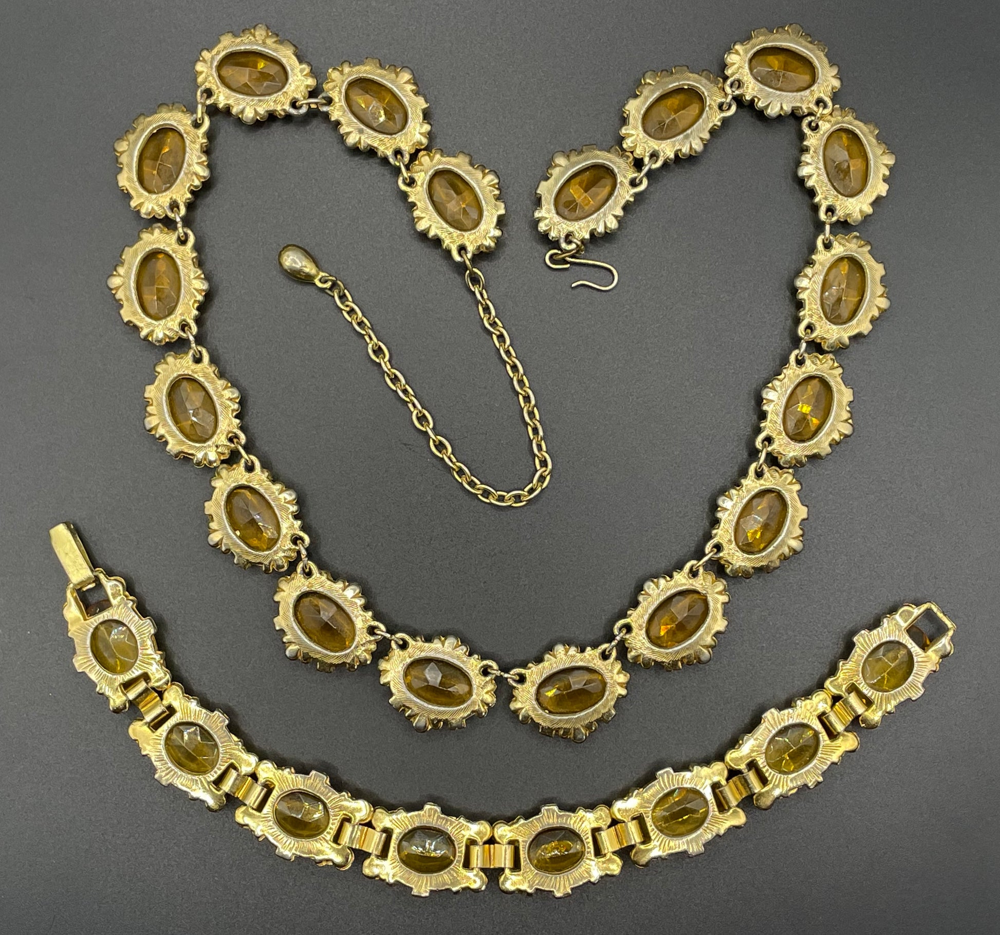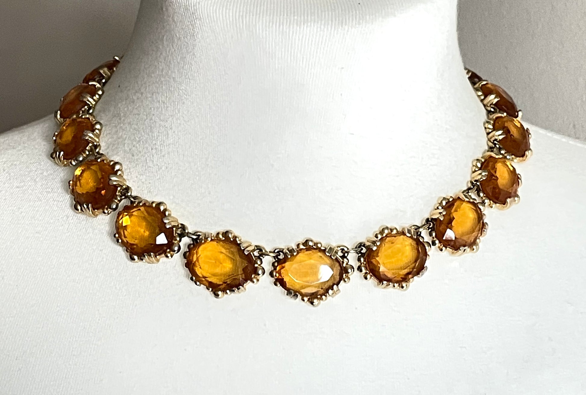 Vintage Sphinx orange citrine / topaz glass riviere necklace and bracelet set, heavy, bezel set, open-backed stones in ornate settings