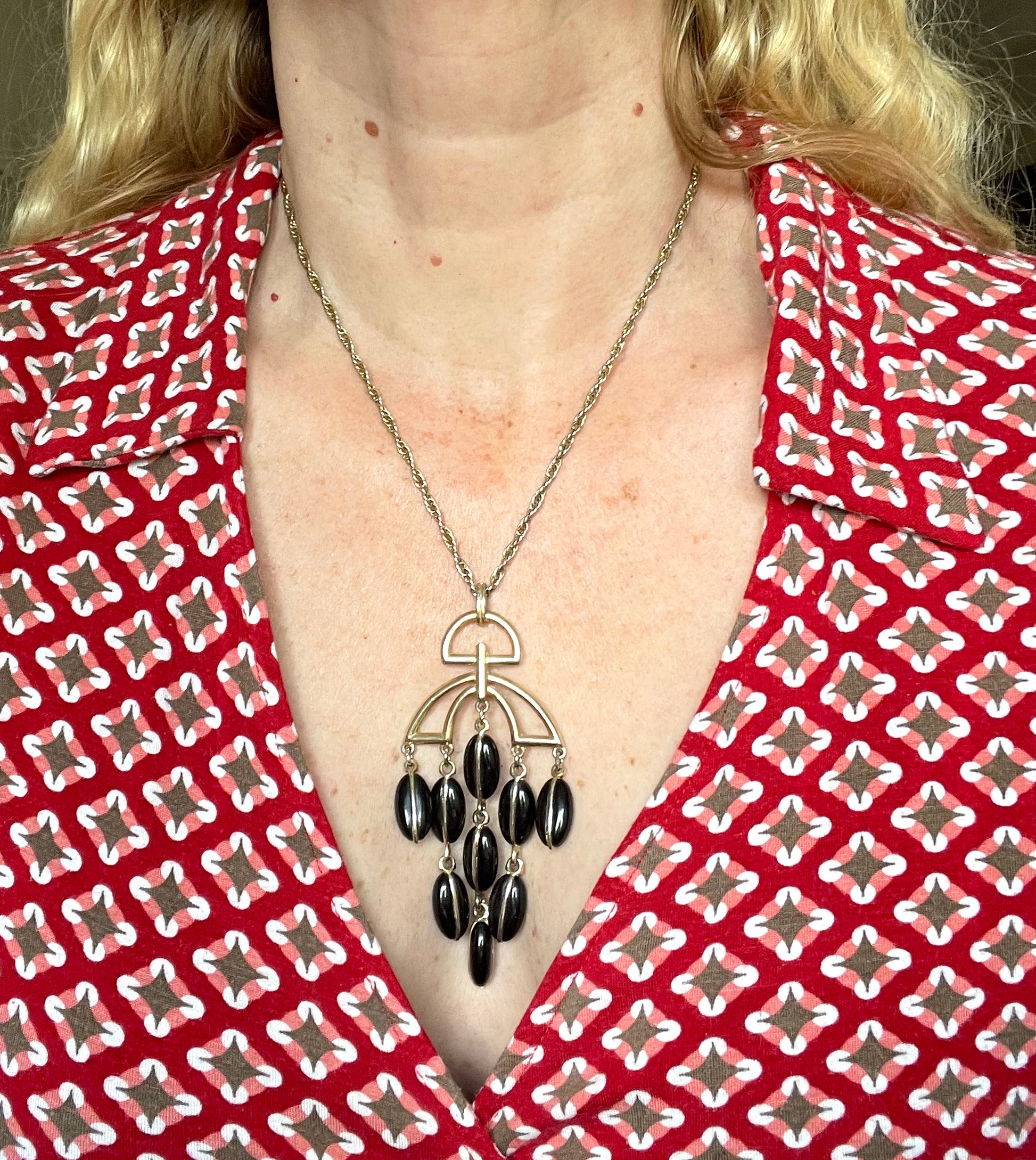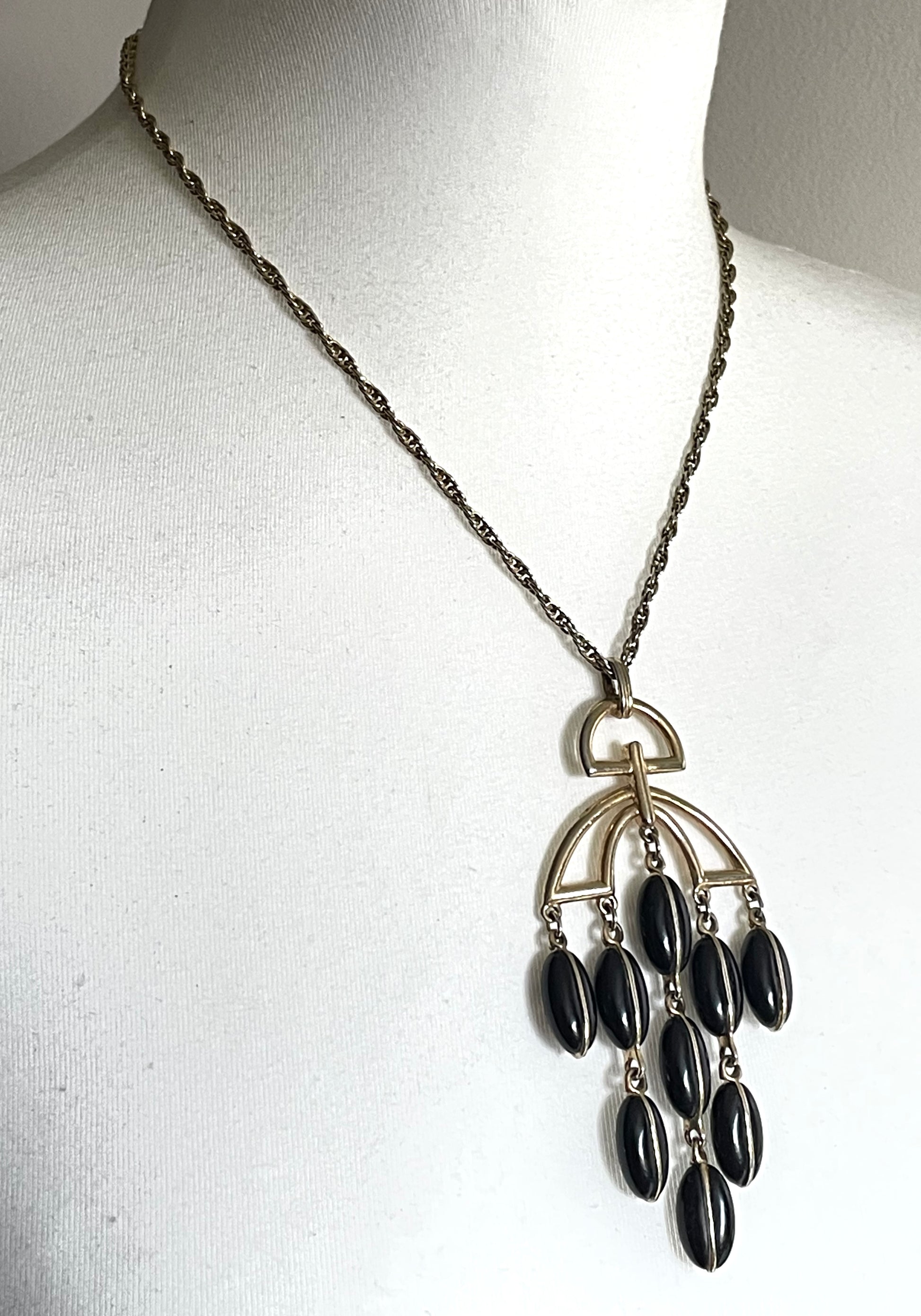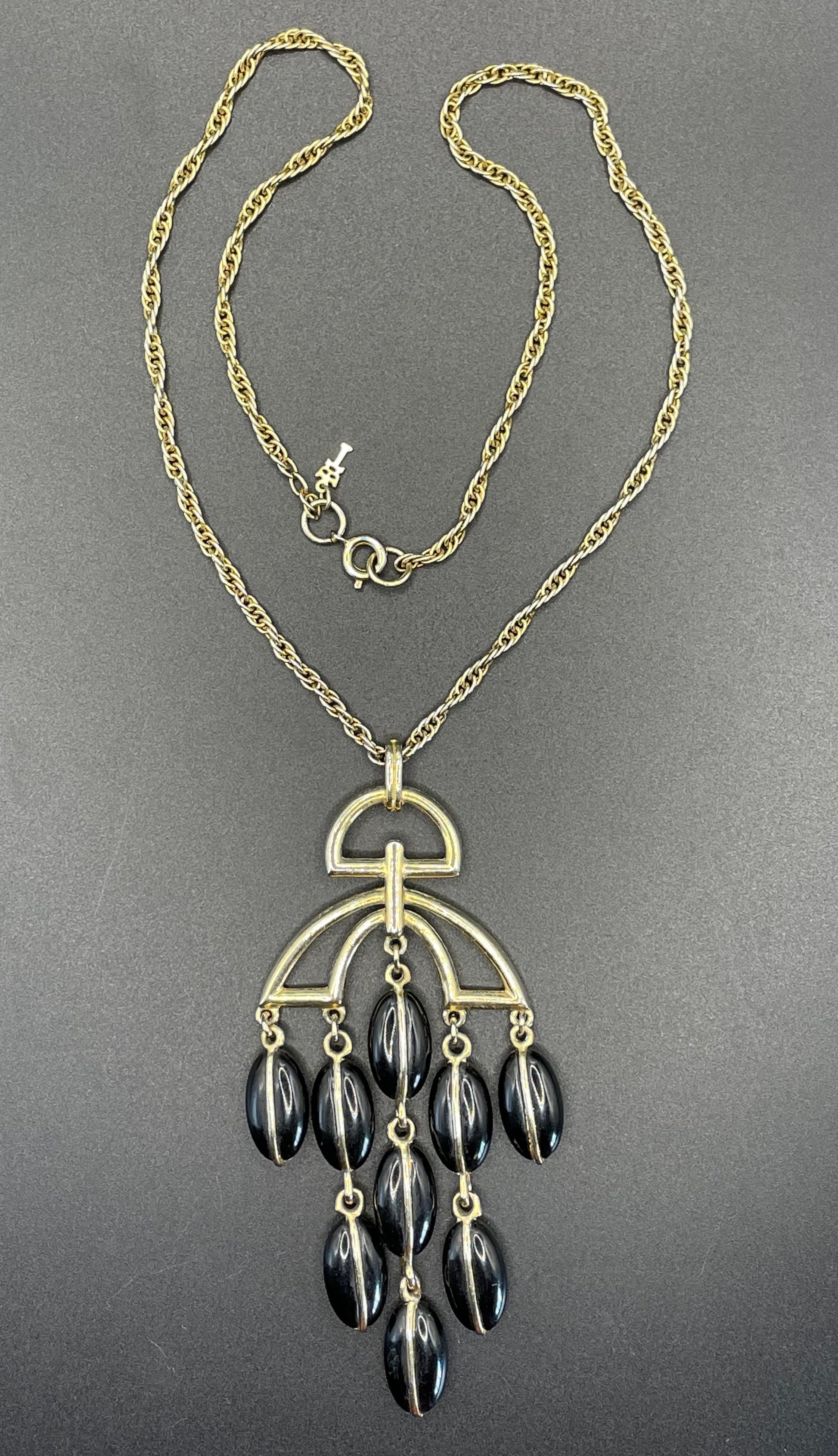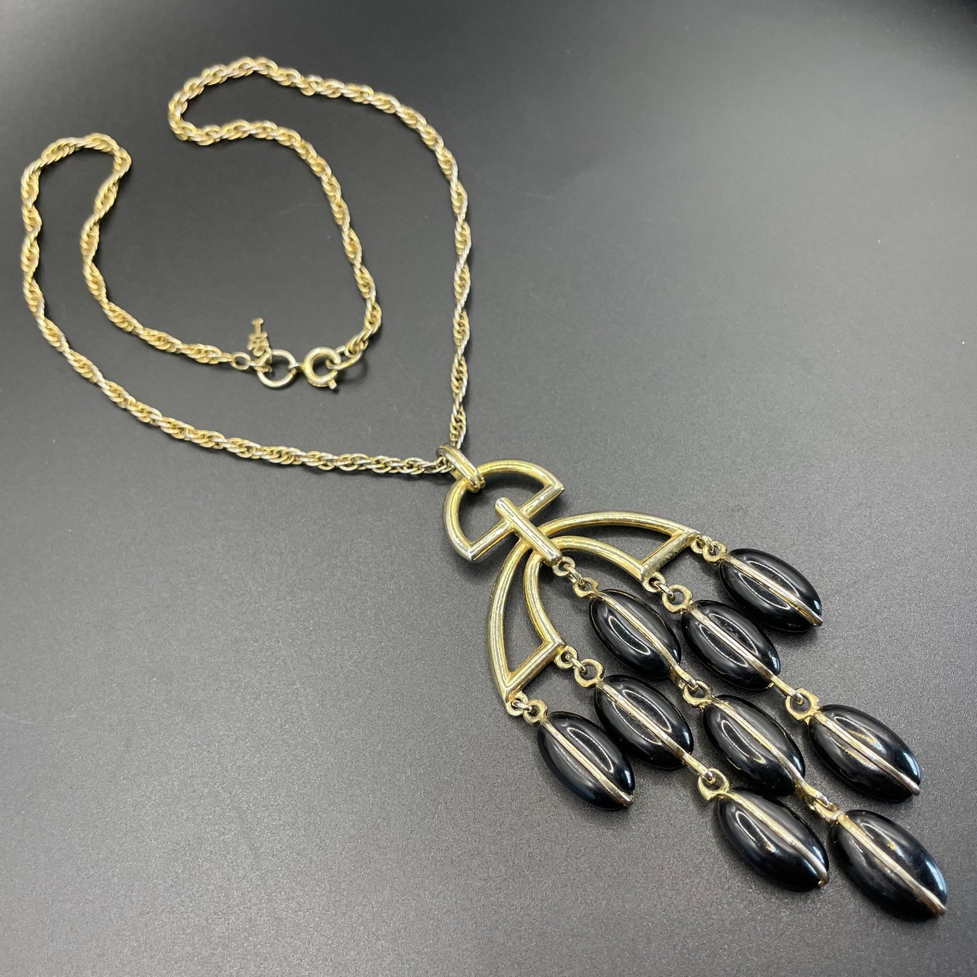 Lovely signed Trifari 1970s gold tone longer length twist chain necklace with gorgeous black plastic beaded chandelier pendant.