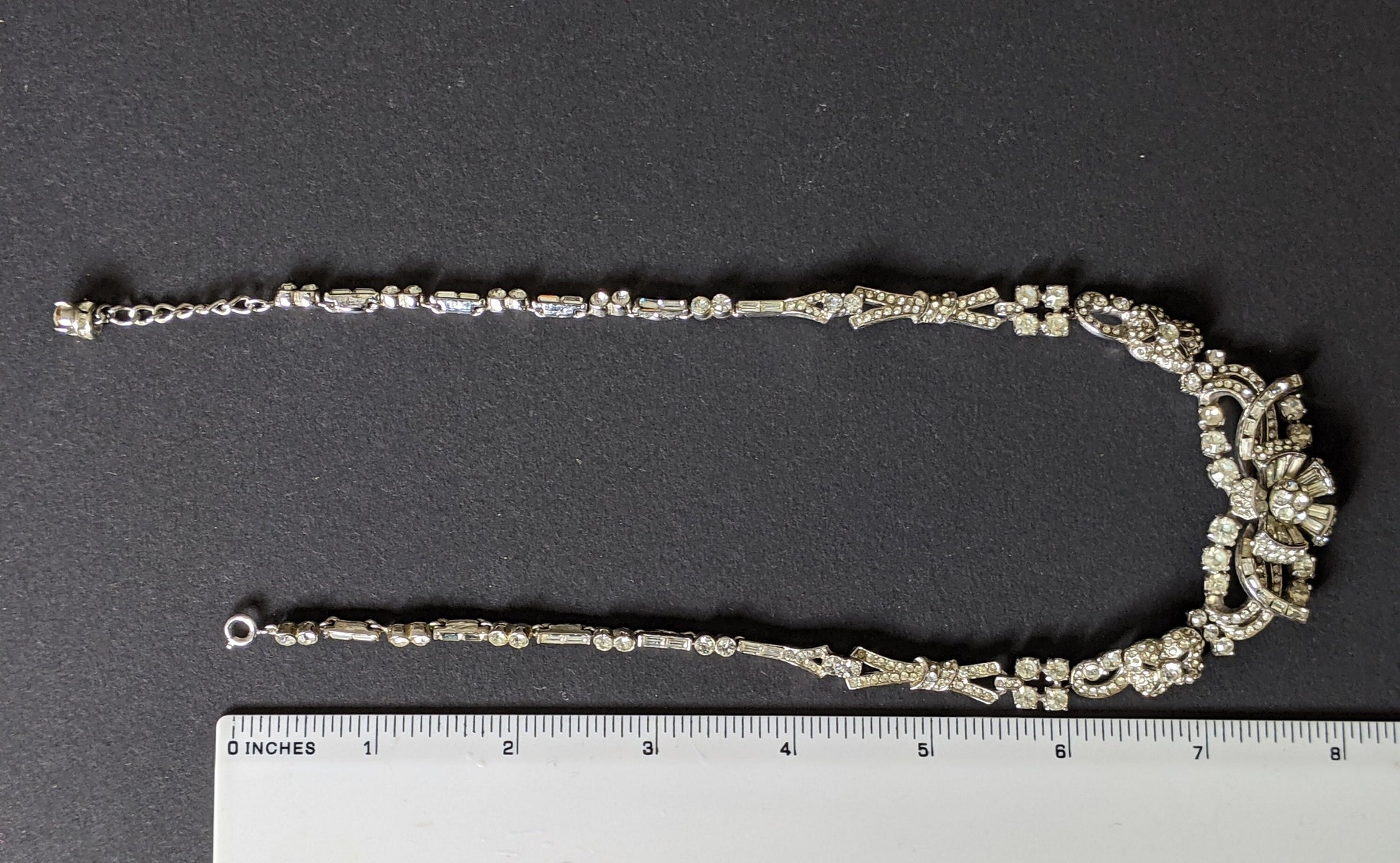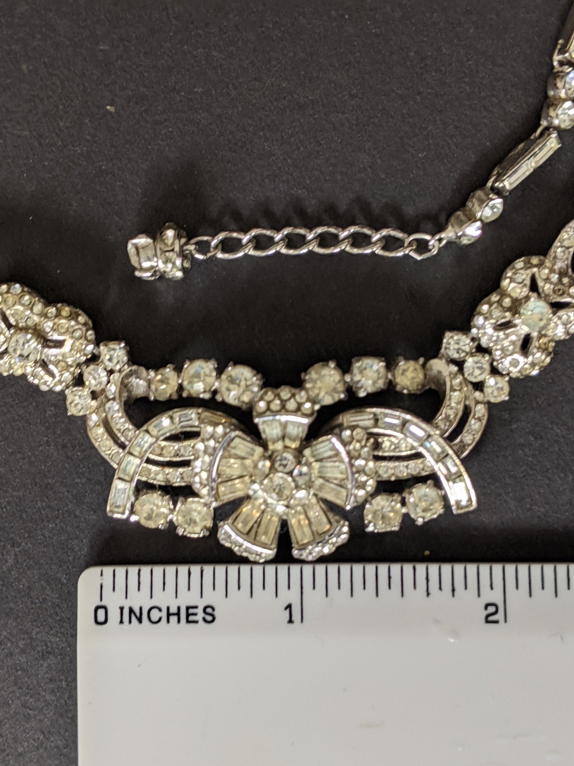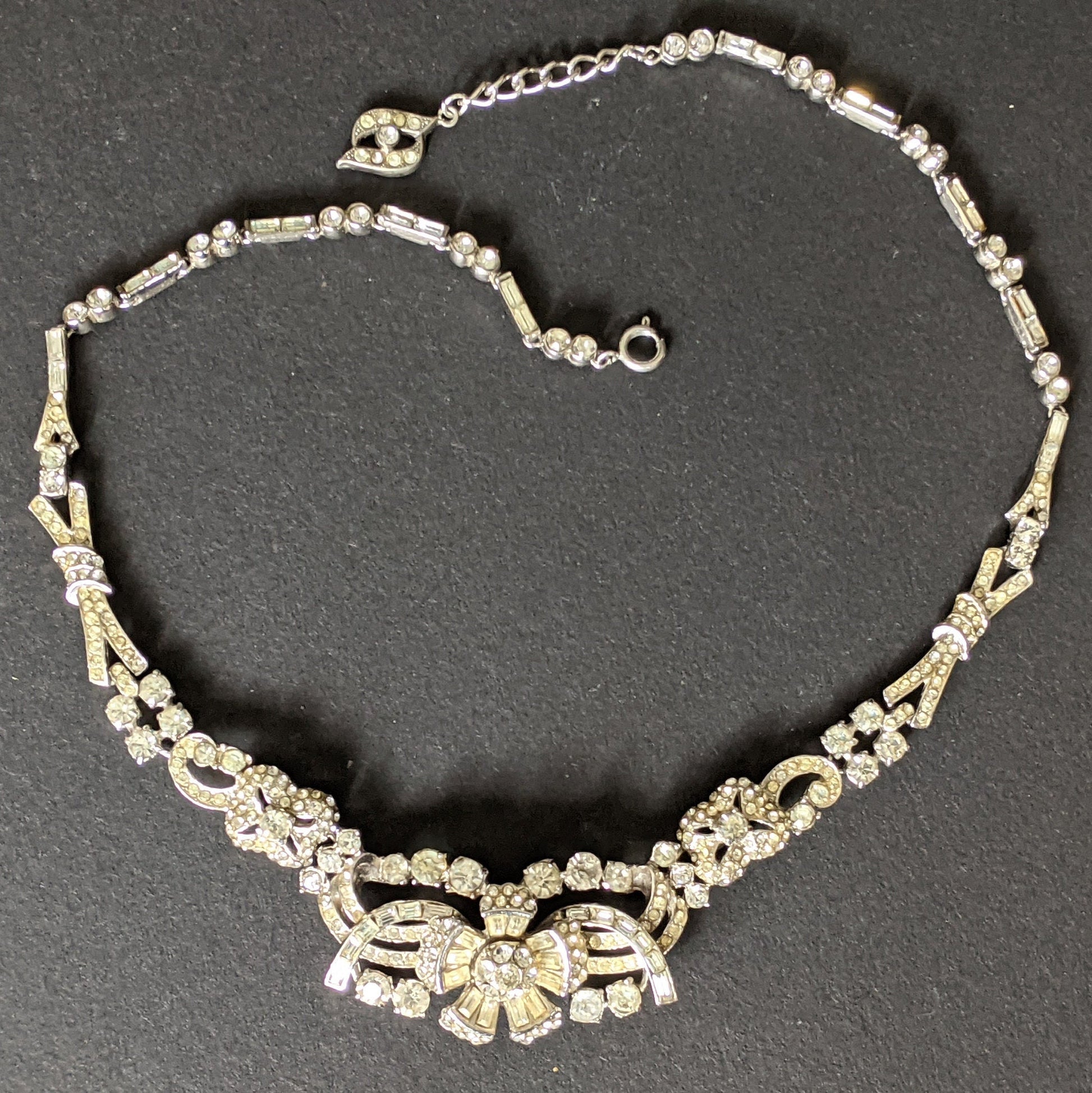 Wonderful vintage necklace consisting of rhinestone embellished silver tone floral panels in an elaborate 3D design. The necklace is encrusted with clear crystal rhinestones throughout, with the addition of baguette cut stones. The necklace is unsigned, which surprised me as this is a design used by the quality maker Attwood and Sawyer (usually signed A&S). However this one is unsigned and so this must be reflected in the price.
