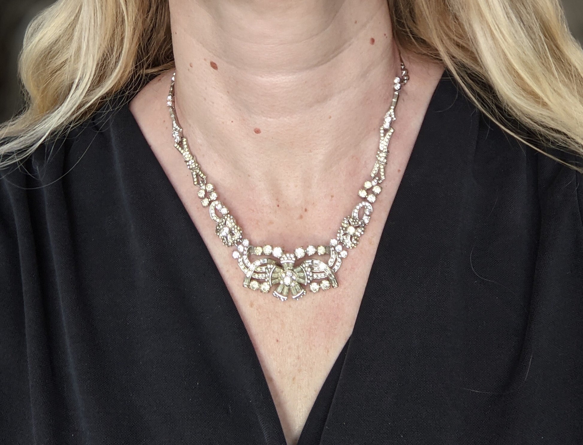 It is in good vintage condition - a little unevenness in the numerous rhinestones, but hard to see. The final picture shows another almost identical necklace I also have in stock, with a slightly different hang tag - please message me if you are interested in this one instead of or as well as the first one pictured.