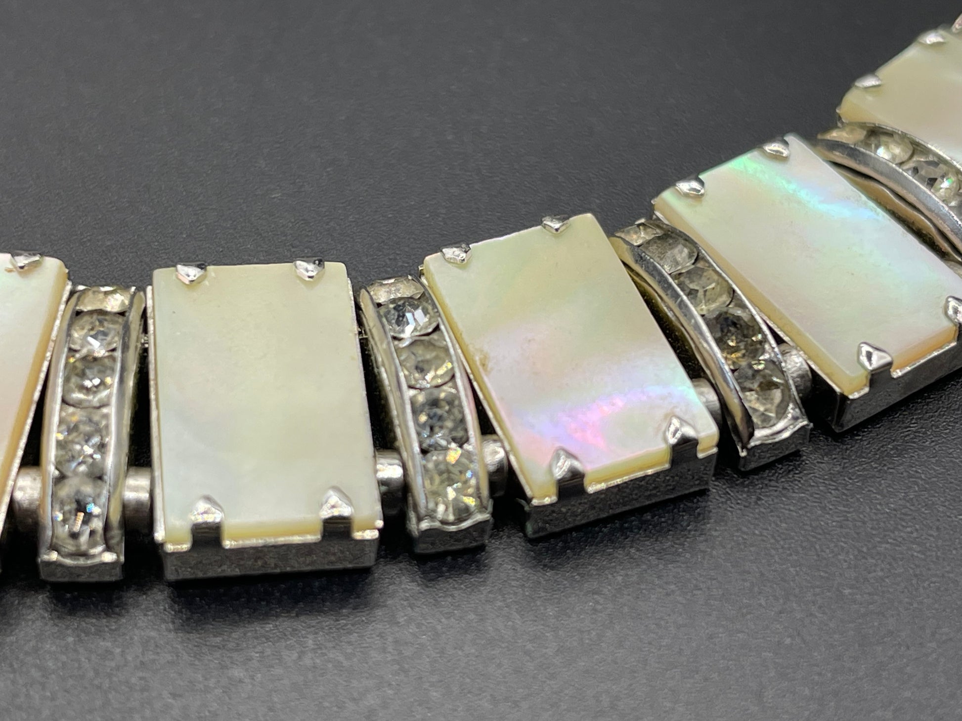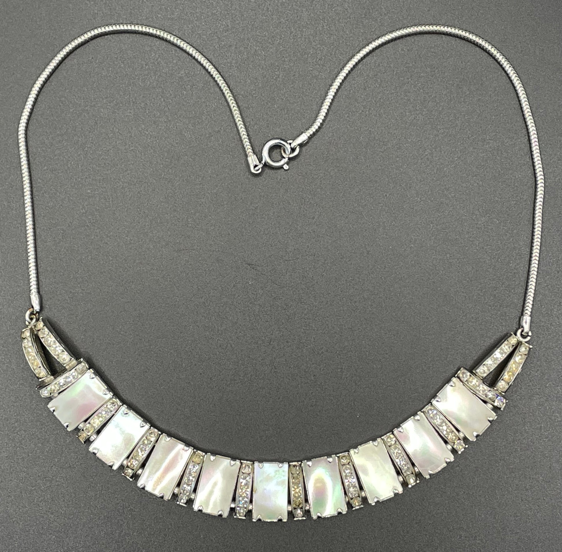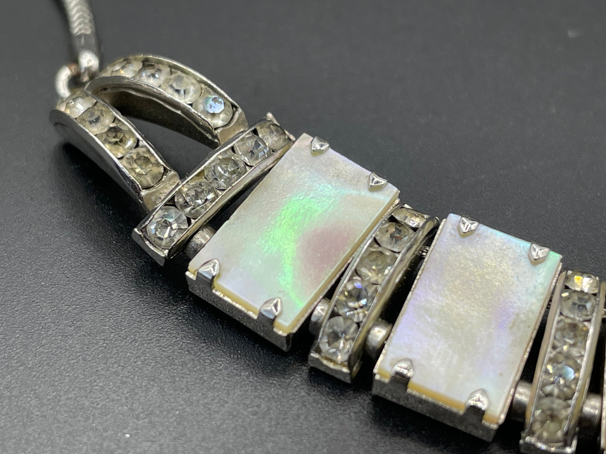 Vintage unsigned Esha Randel / Schreiber & Hiller Art Deco paste rhinestone and mother of pearl silver tone machine age necklace