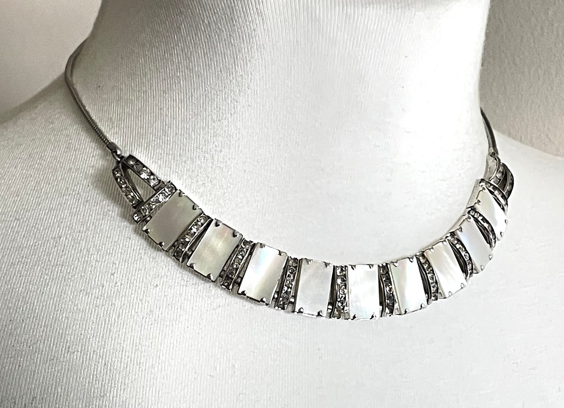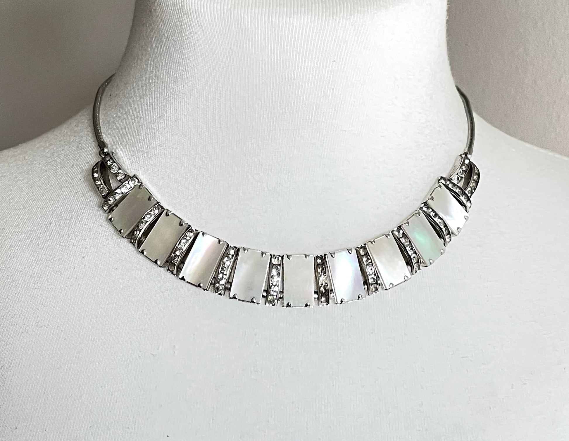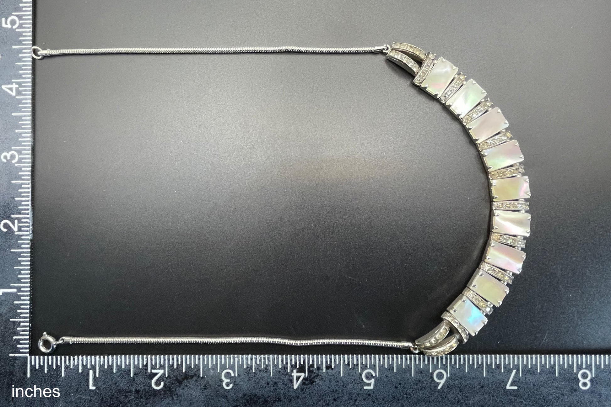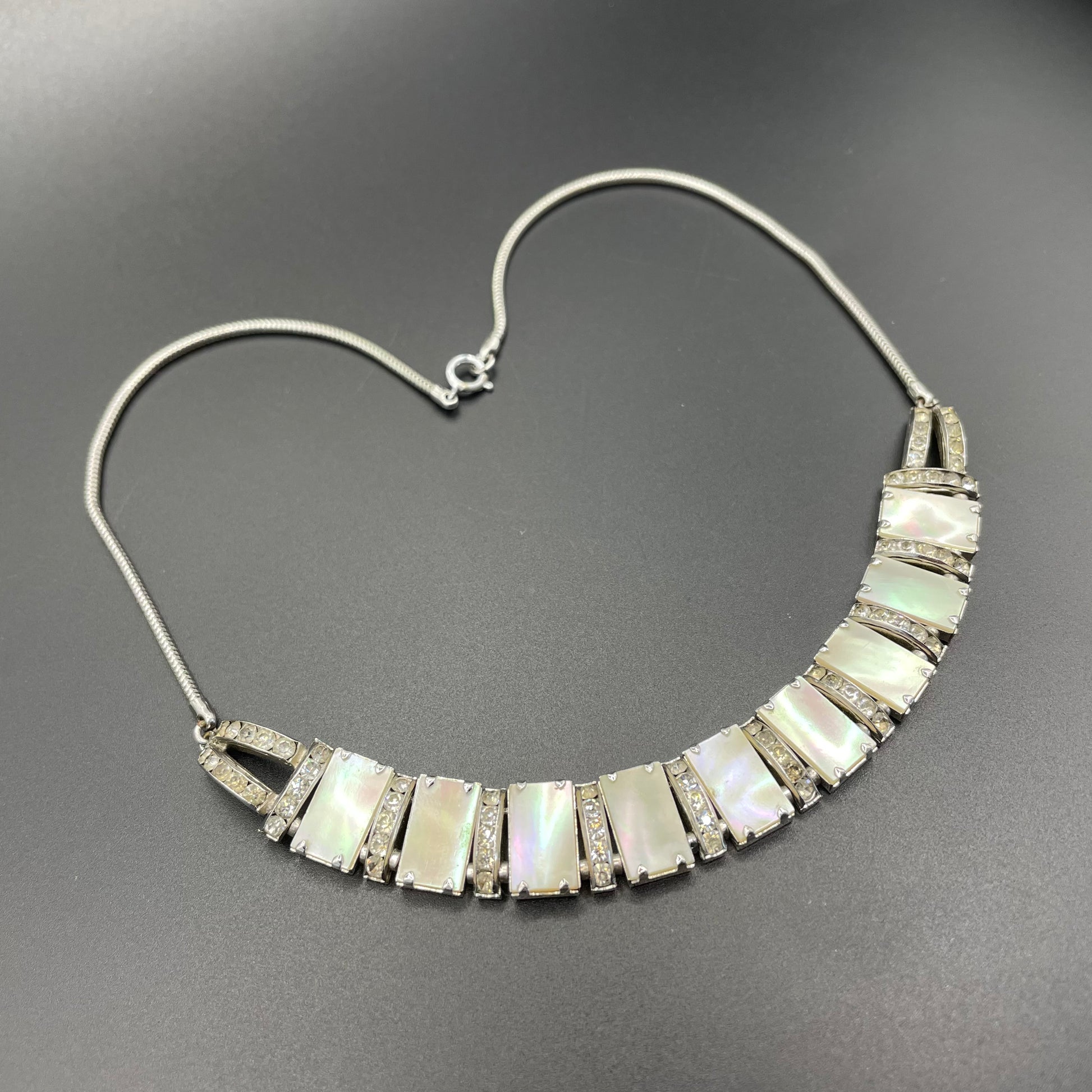 Vintage unsigned Esha Randel / Schreiber & Hiller Art Deco paste rhinestone and mother of pearl silver tone machine age necklace