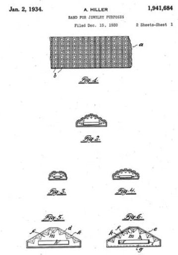 The final picture shows a copy of the 1930 patent submitted by A Hiller to produce this type of channel set design. Made by Schreiber and Hiller in Germany as we now know, these pieces are beautifully and intricately engineered. The snake-like links follow the curves of the wrist and feel comfortable to wear.