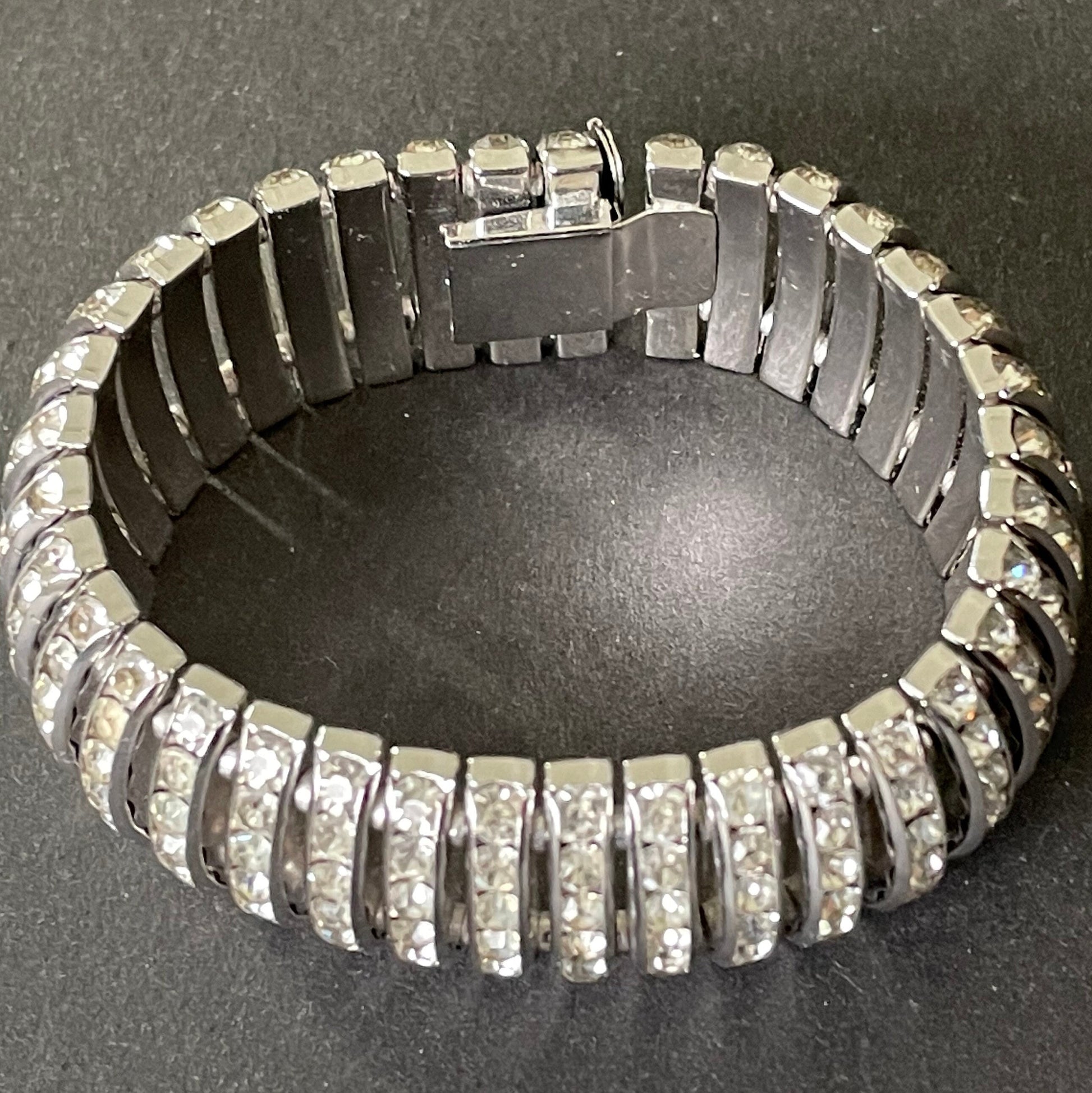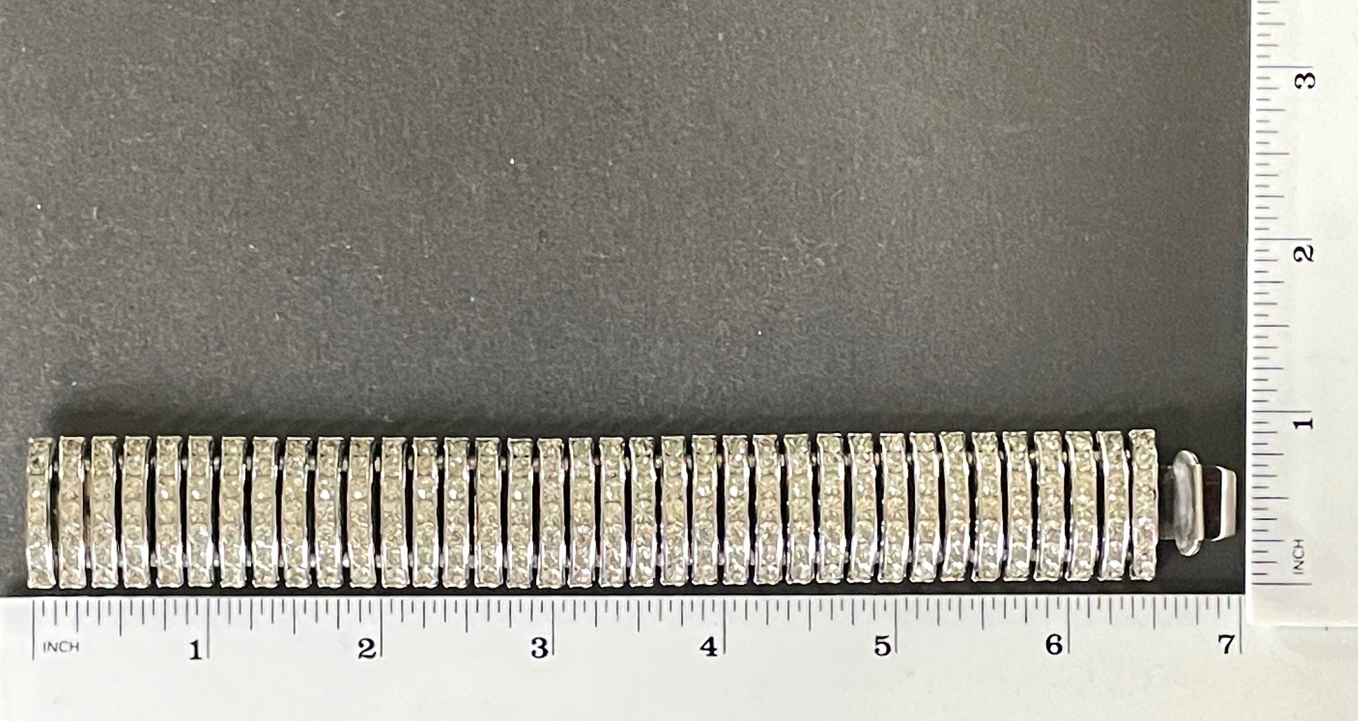 Wonderful vintage Art Deco DRGM wide bracelet set in silver tone with geometric design and numerous channel set clear rhinestones. This design has the classic Schreiber & Hiller channel set links - the type of links often used under their trademark 'Esha Randell'. There are no stamps or signatures on this particular bracelet however.